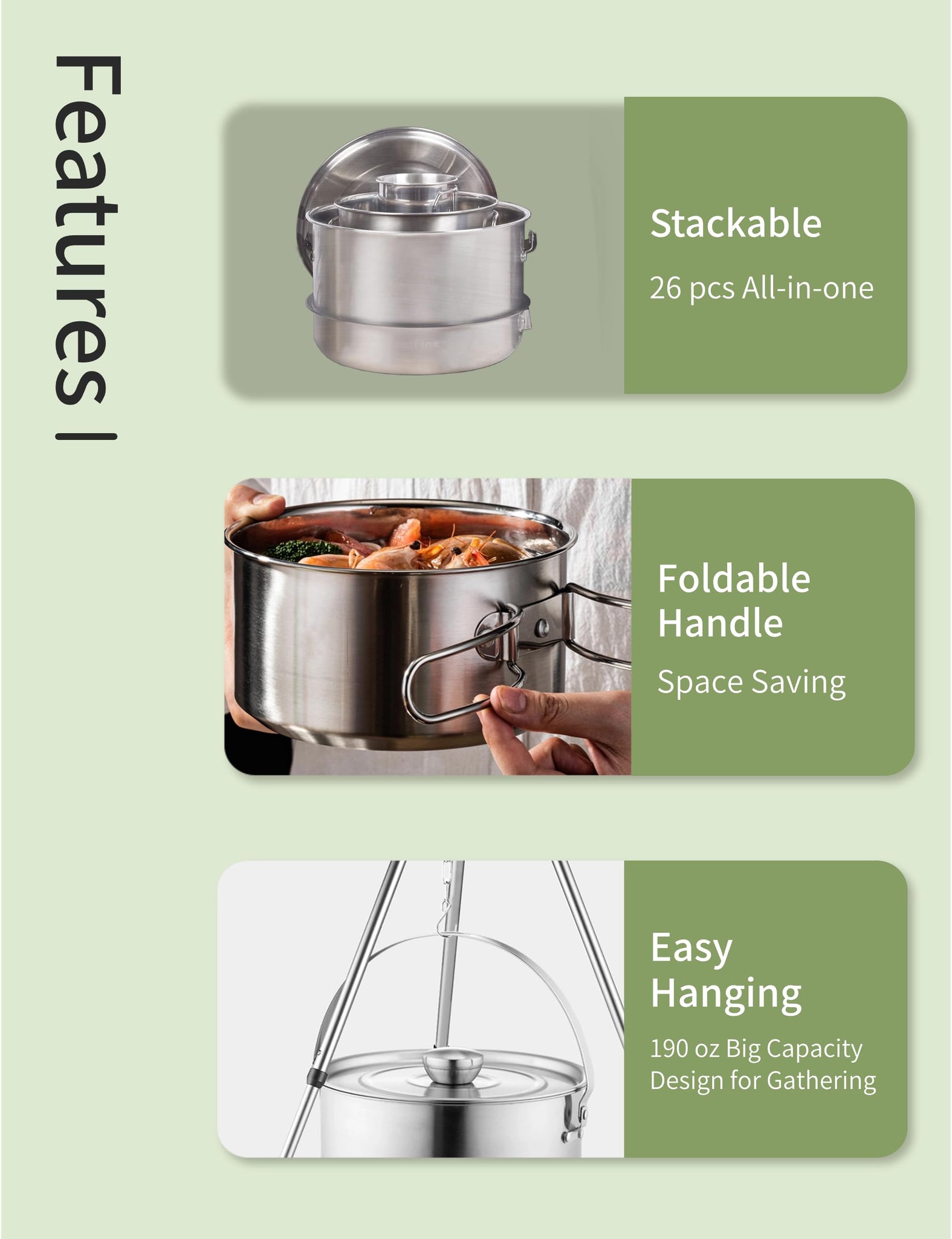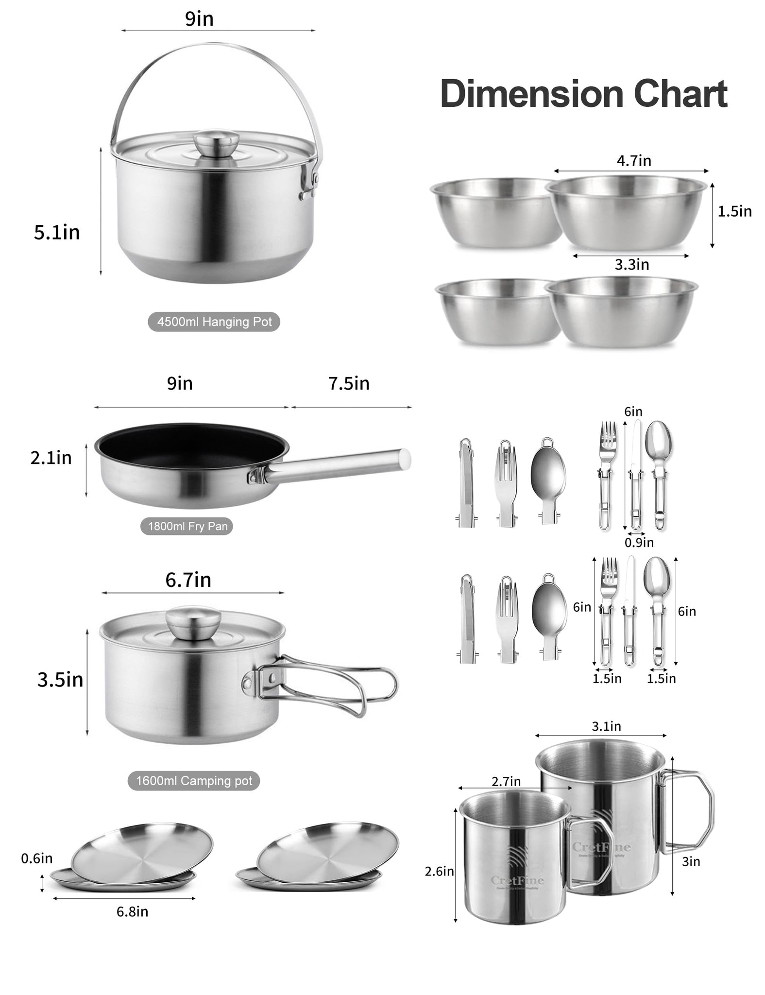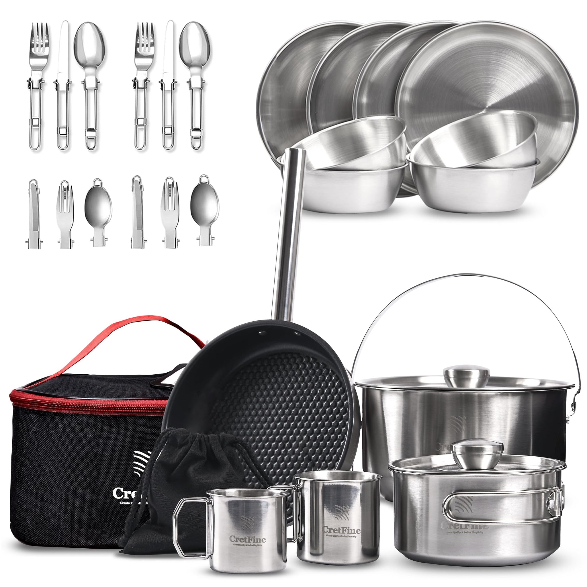 • 【🌄 Strong 304 Stainless Steel】: The CretFine camp set is constructed from strong 304 stainless steel, known for its exceptional durability. With this feature, the stainless steel camp cookware set can withstand the rigors of outdoor adventures, and last for years.