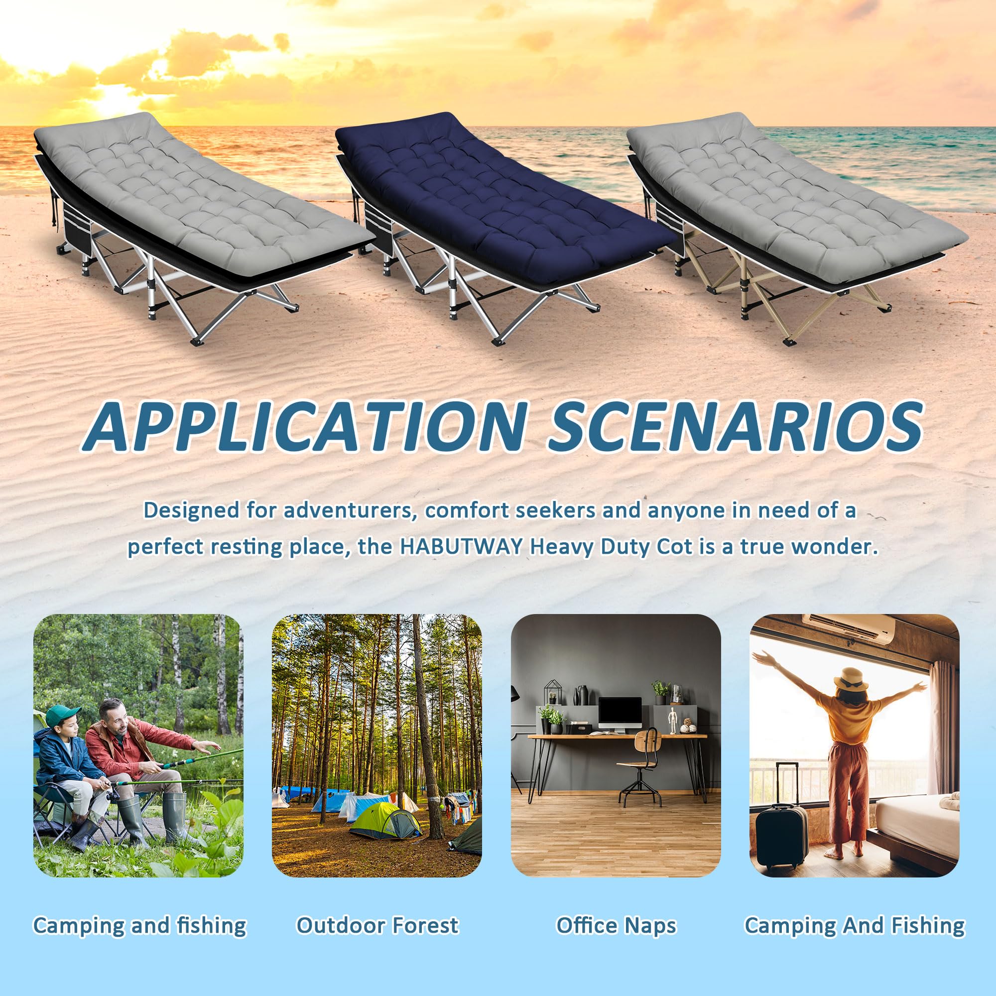 - Heavy Duty Camping Cot: HABUTWAY camping cot is made of high-quality carbon steel. The X-shaped structural frame and 10 non-slip support legs ensure the stability of the camp cot. 600 LBS weight capacity, it's sturdy enough to hold the weight of most adults, an ideal sleeping cot for adults.