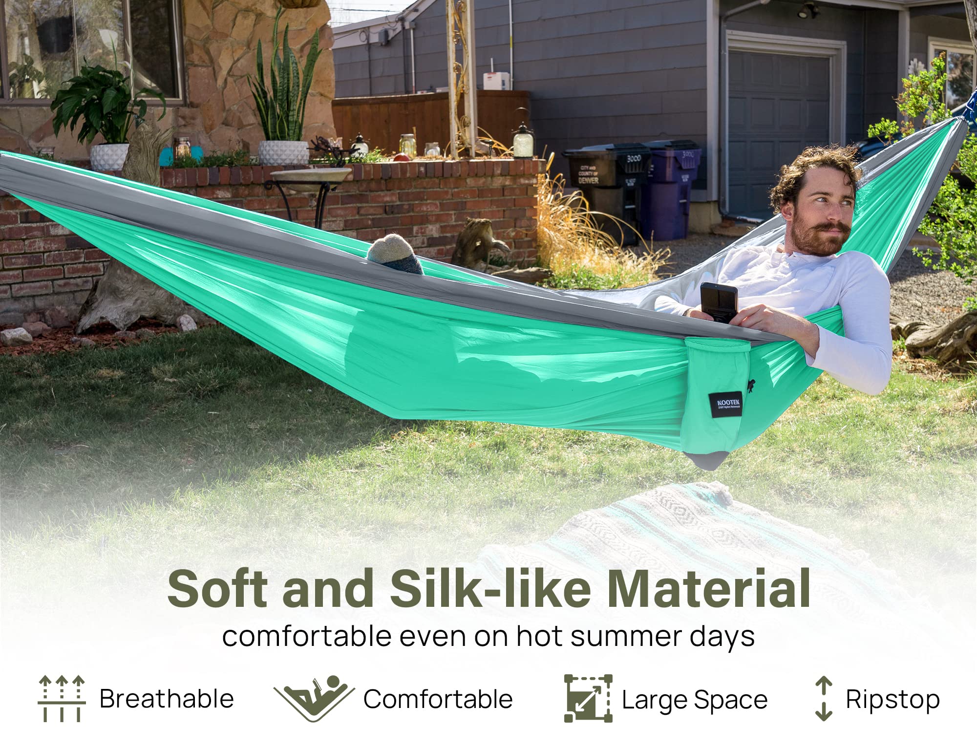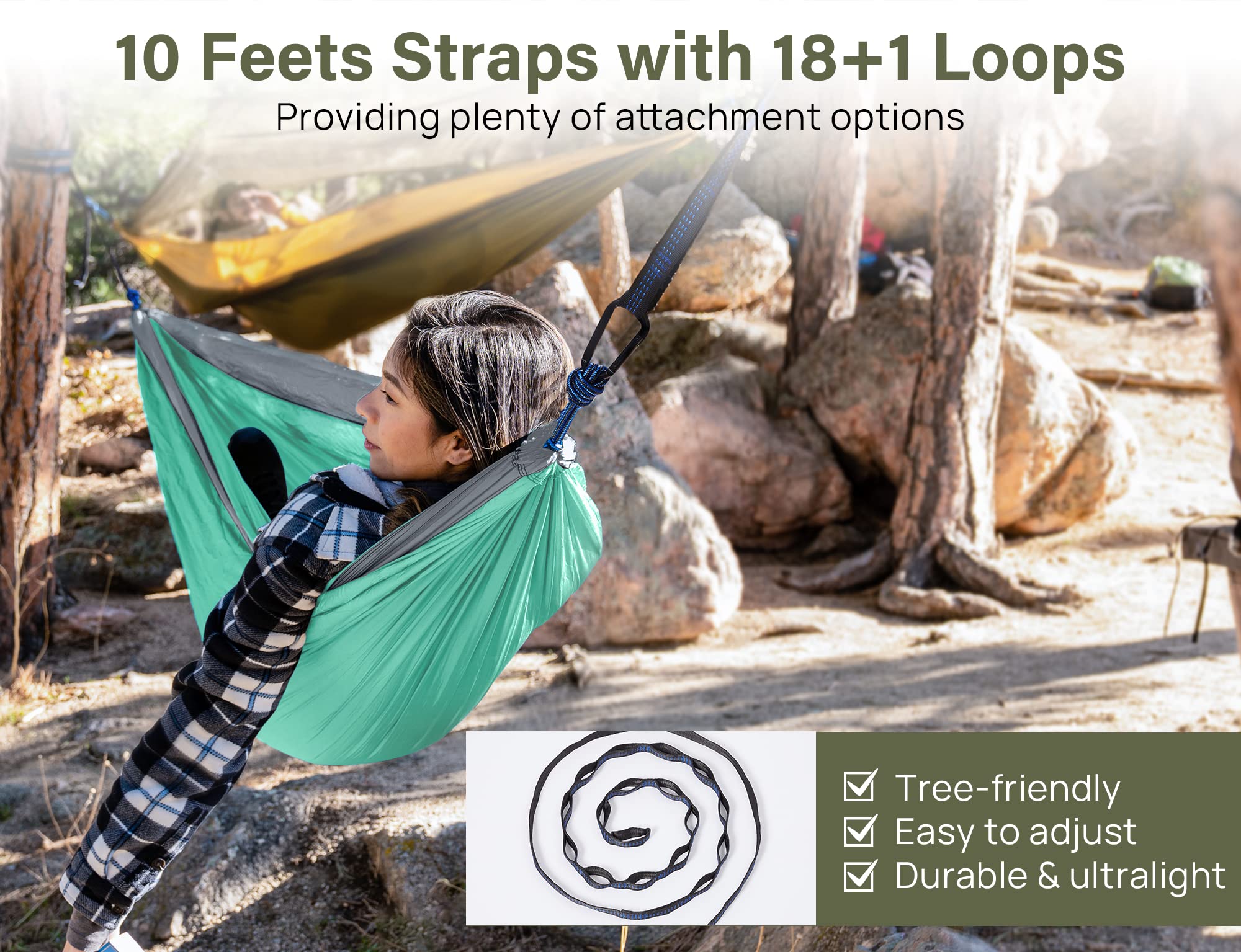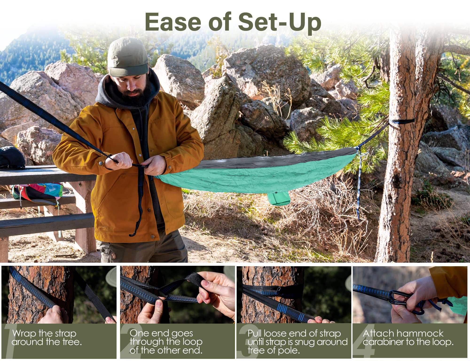 - Easy Setup: Setting up your lightweight hammock has never been easier! Our hammock comes equipped with tree-friendly straps and carabiners, featuring 18+1 separate loops on each strap, allowing for easy and adjustable height and comfort—no need to struggle with knots, just clip on and adjust to your desired level of relaxation.