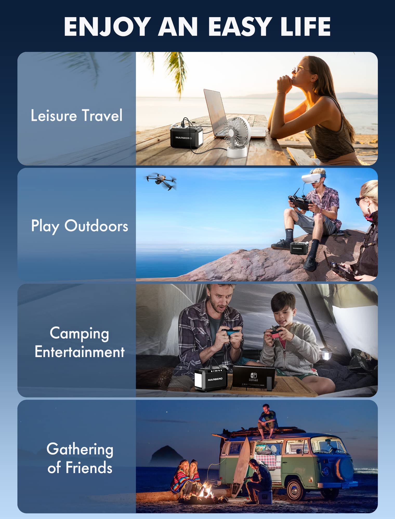 - Ideal Gift for Family and Friends: This portable power bank with AC outlet is also suitable for camping, fishing, traveling and powering festival led lights. You will receive 1* MARBERO 88Wh portable power bank, 1*User Manual, 1*Cigarette lighter, 1*AC Charging Adapter.