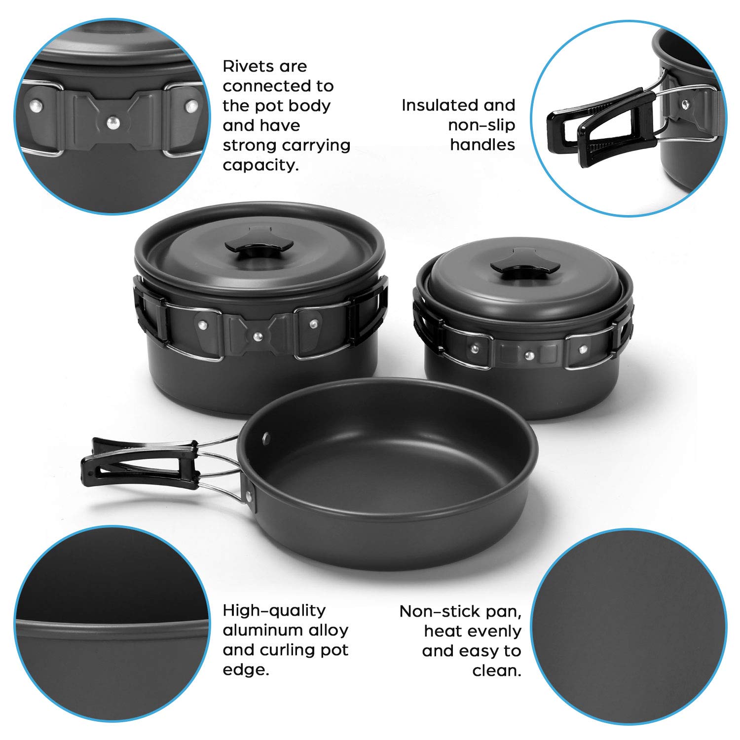 Details: DescriptionOdoland always provides the MAXIMUM cookware set at MINIMUM price. This set comes with 15 pieces - 1 x large pot, 1 x small pot, 1 x frying pan, 2 x cups with silicone protectors, 2 x spoons, 2 x forks, 2 x knives, 1 x cleaning cloth, 2 x bag for cutleries and 1 x mesh bag. Designed as high durable and made to last, it's perfect for anyone loves outdoor activities! One Kit meets all your needs! It will be your great outdoor companion, no matter you go camping, hiking, climbing, hunting or just go for a picnic!