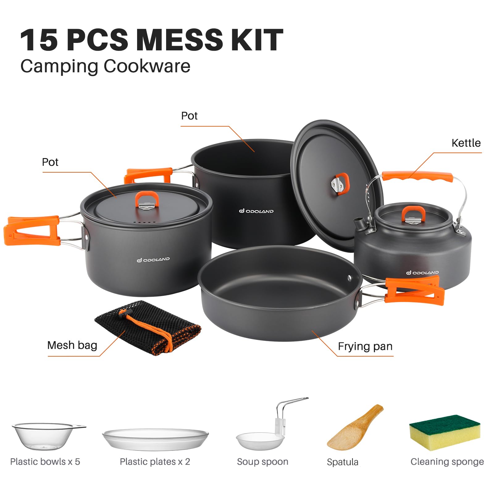 • The Best Money You Ever Spent - The 15pcs camping cookware set includes 1 x 2L pot, 1 x 2.9L pot, 1 x fry pan, 1 x 1.1L kettle, 2 x plastic plates, 5 x plastic bowls, 1 x soup spoon, 1 x banboo spatula, 1 x cleaning sponge and 1 x mesh bag. A great choice for hiking, backpacking, camping or any other activity.