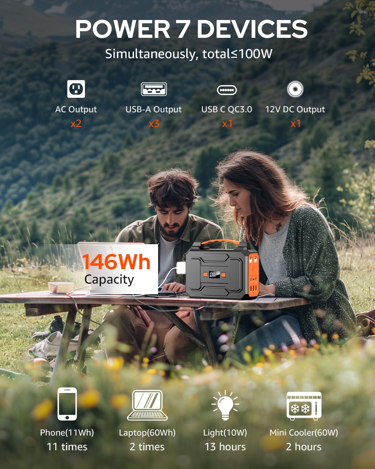- PORTABLE POWER STATION WITH LARGE CAPACITY: This portable power station solar power bank with AC outlet 146Wh/39600mAh is powerful enough to charge your devices like laptops, phones, tablets, cameras, drones, fans, in-car appliances. Portable Power Station weights only 3.3lb, fits perfectly in backpack or suitcase, making it a great portable power station for camping, hurricanes, emergency, home and outdoor activities.