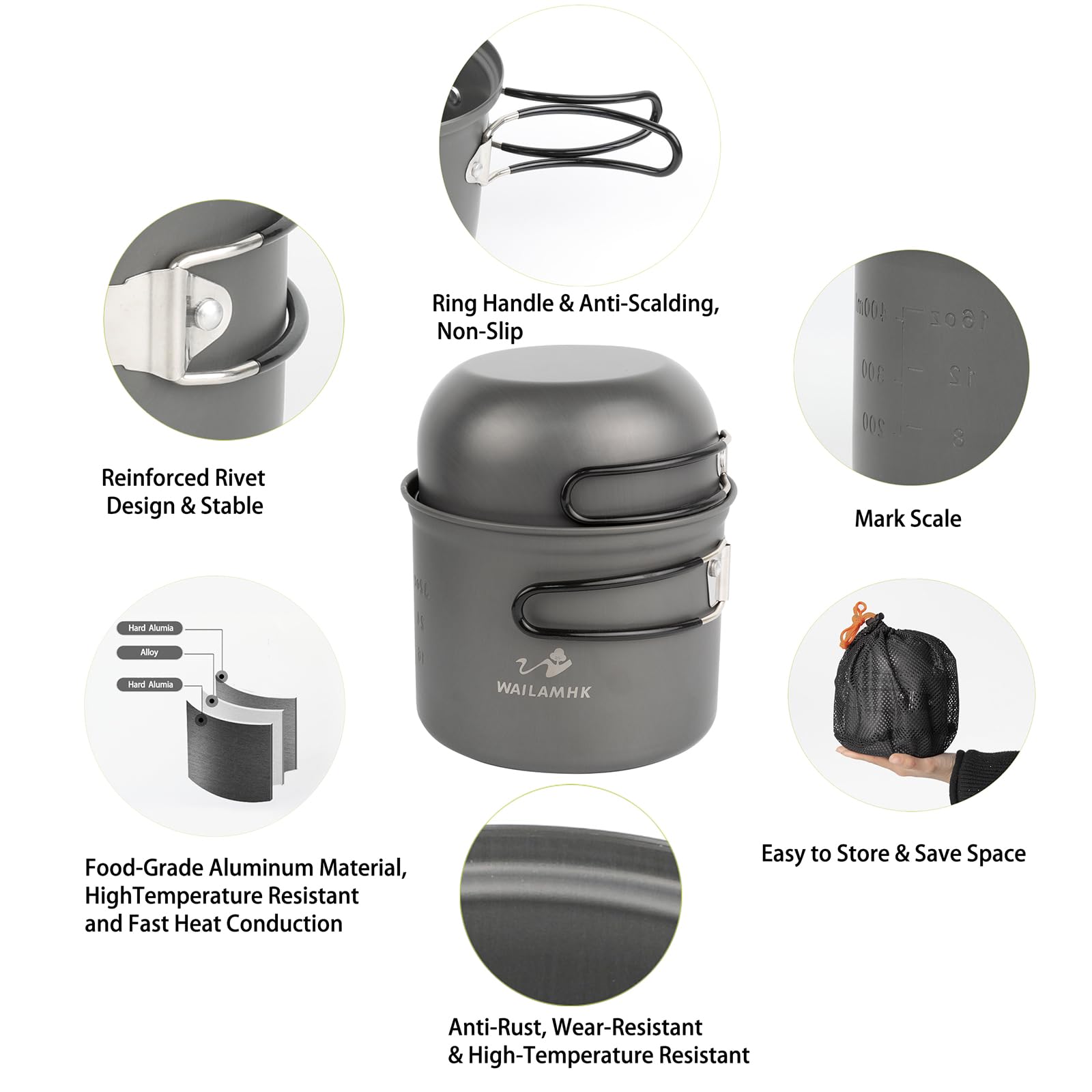 - Anti-Scalding Design: The set features high-temperature resistant, anti-scalding pot lids and silicone ring handles. This thoughtful design prevents burns and ensures safe handling, allowing you to cook confidently even in the wilderness.