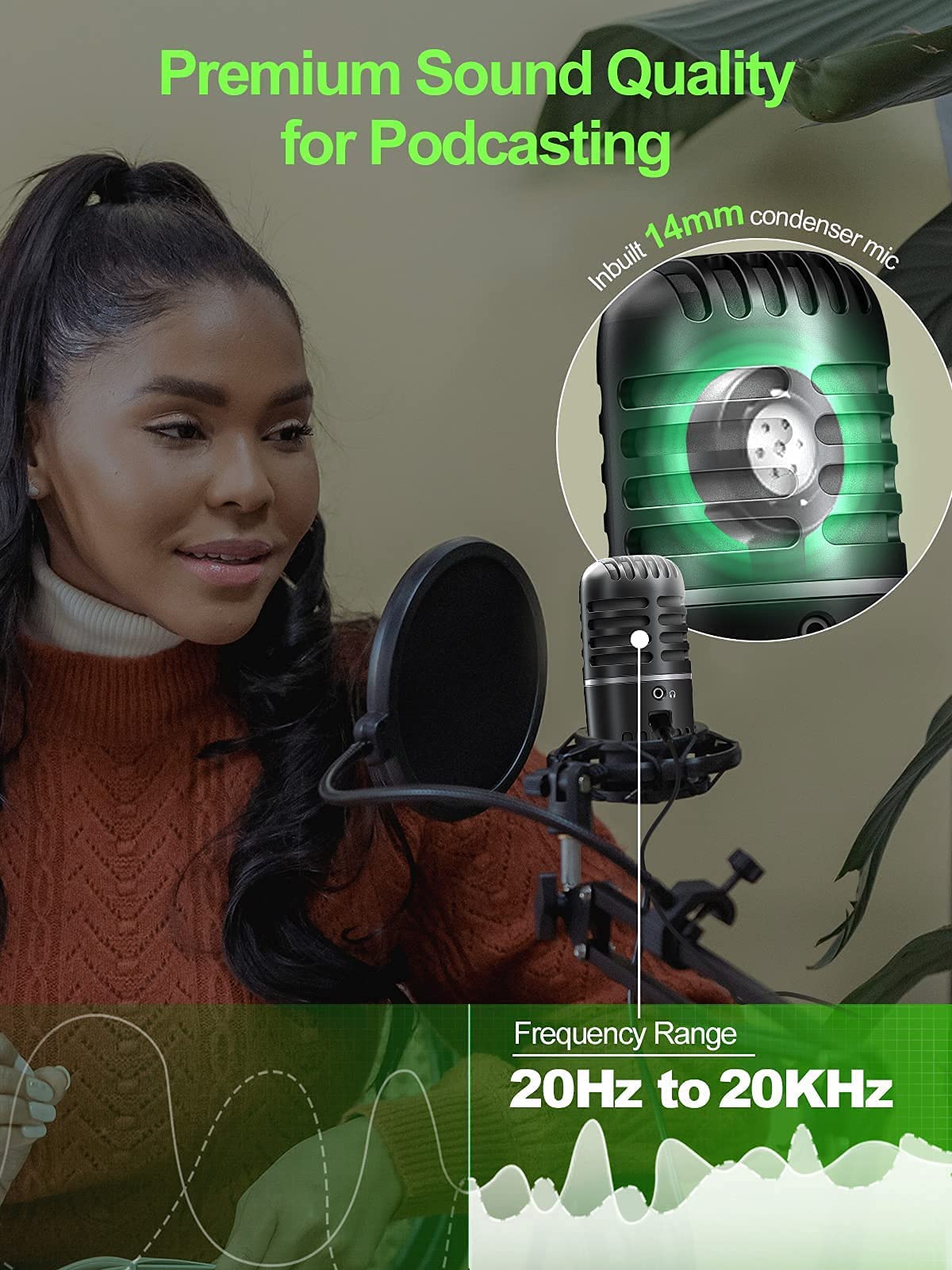 • 【Premium Sound Quality for Podcasting】Inbuilt 14mm condenser mic with flat frequency response (20Hz to 20KHz), EMP USB Microphone reflects your full-bodied voice with high pitches and deep lows. With the Classic Sound Grid structure and inner-surrounded windscreen foam, the microphone is isolated from noise like vocal plosives and electromagnetic interference, perfect for podcasting, streaming and conferencing.