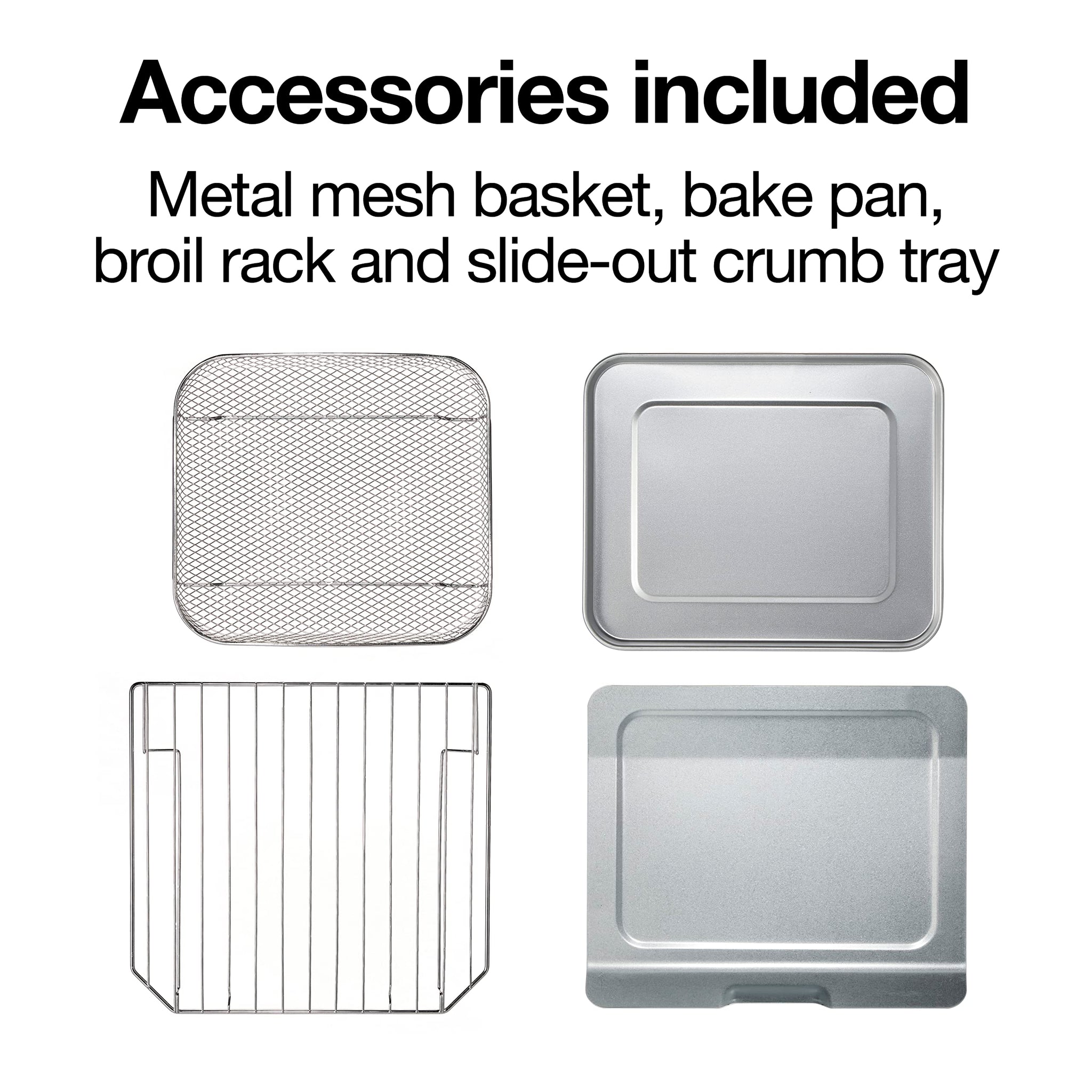 - INCLUDES MESH BASKET FOR AIR FRYING, BAKE PAN AND BROIL RACK: The air fryer oven comes with everything needed to air fry, bake, broil and toast, plus a slide-out crumb tray. Mesh basket fits on the upper oven rack with bake pan below to catch drippings.