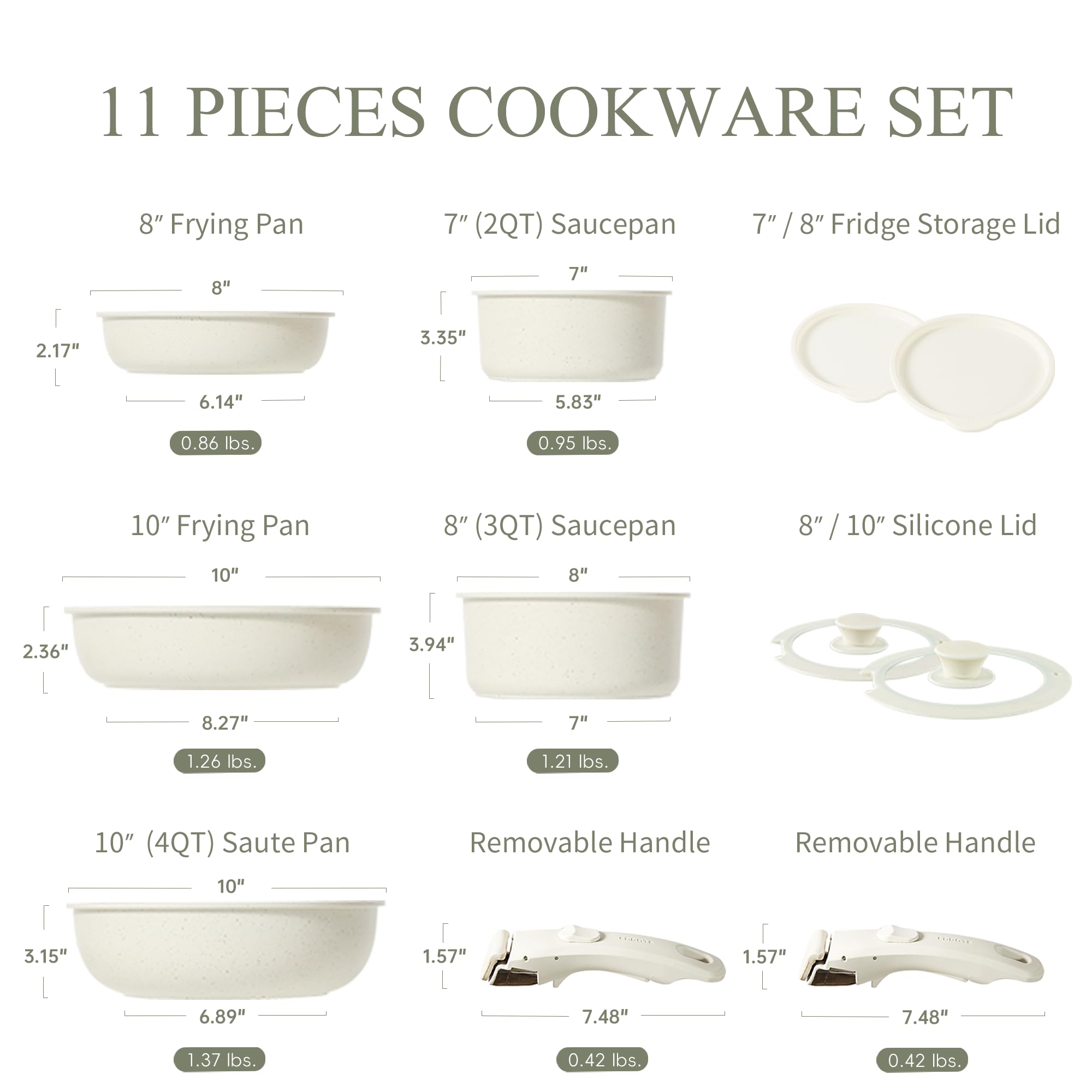 - · Multitaskig Cookware Set: Removable handle for the ultimate versatility– go from ALL kinds of stoves to the oven, to the grill, to the fridge, and onto the table in a click. The handle is upgraded for secure when attached during cooking.