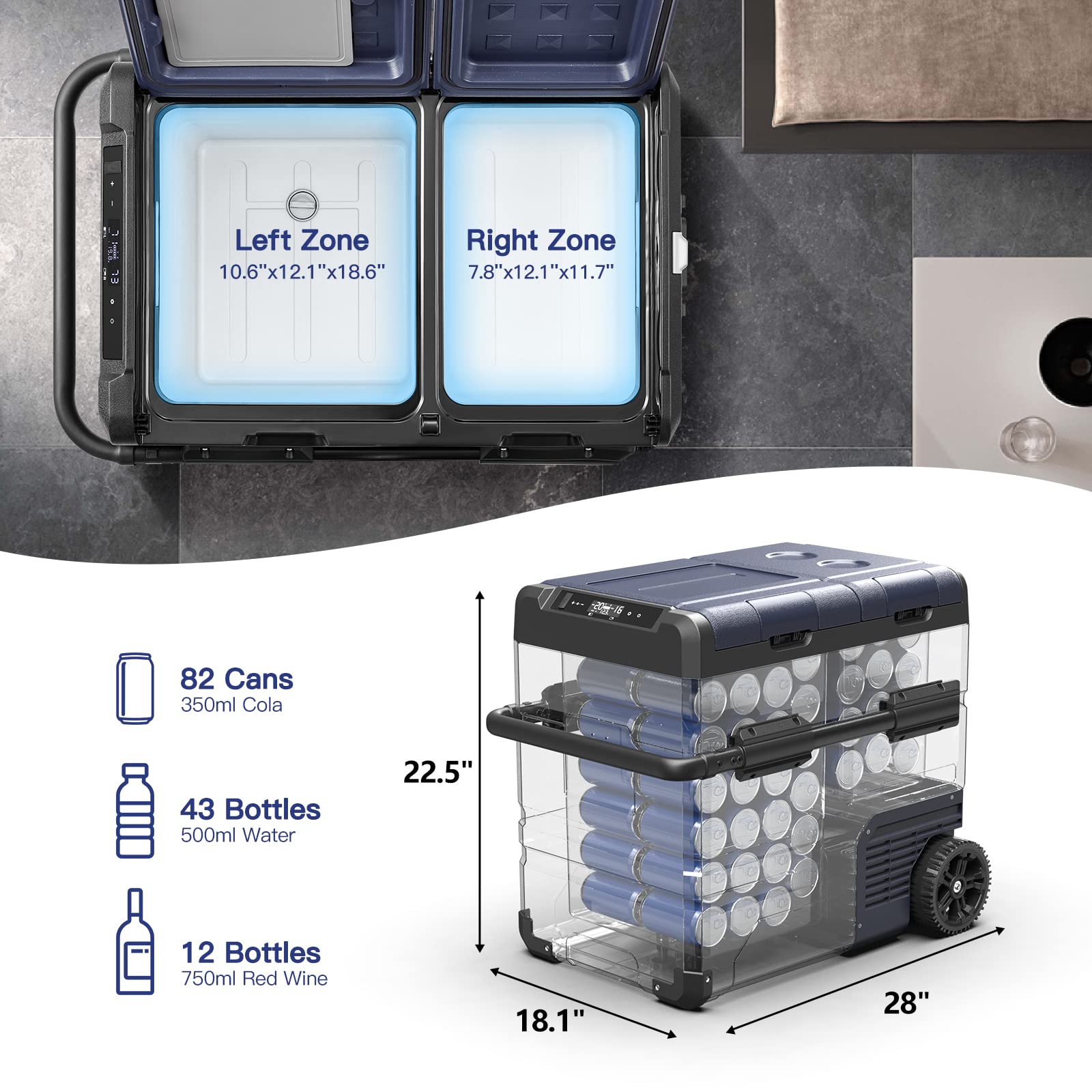 - Large Capacity Dual Zone With 2 Doors Car Fridge: BODEGACOOLER 12 volt car refrigerator has dual zone and double door, you can control the temperature separately for true dual zone temperature control. It can be used as both a refrigerator and freezer, but also as a fridge/freezer, refrigerator/freezer, or freezer/freezer, so you can cool drinks and freeze meat at the same time.Two detachable doors convenient for your daily use