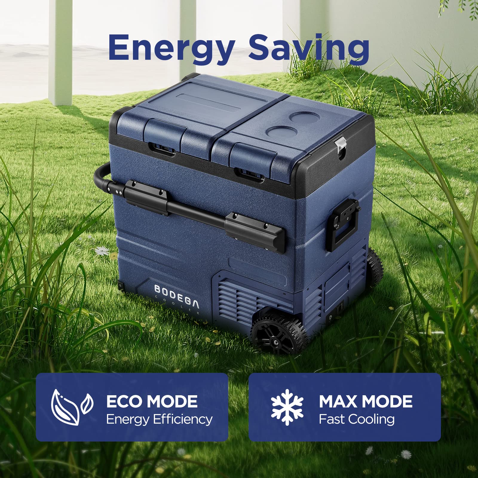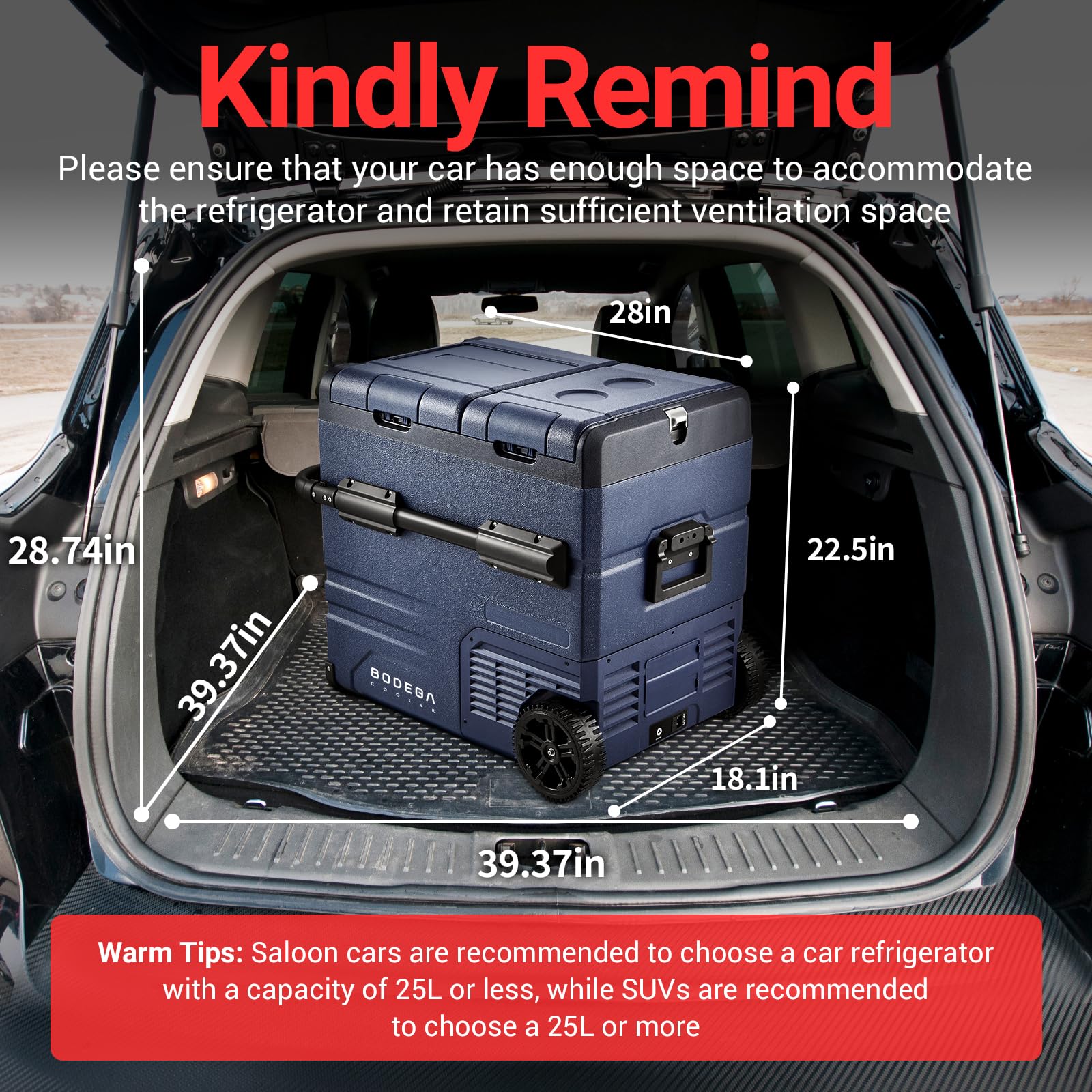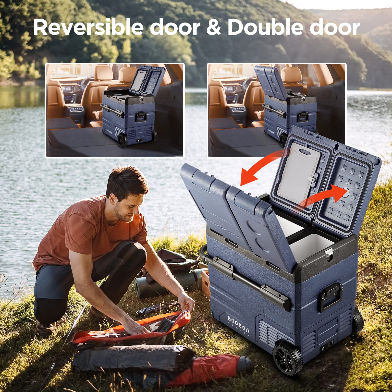 - User Friendly Design Friportable Fridge Freezer: The door of BODEGACOOLER car refrigerator can be removed at will to change the opening method according to your needs/scenario/habit, making it more convenient for you to get food and drinks while driving; and our refrigerator comes with superior off-road wheels(non-slip) and solid extendable handle, making it more convenient to carry when you go on picnics and excursions.Our portable car refrigerator allows you to enjoy cold drinks.