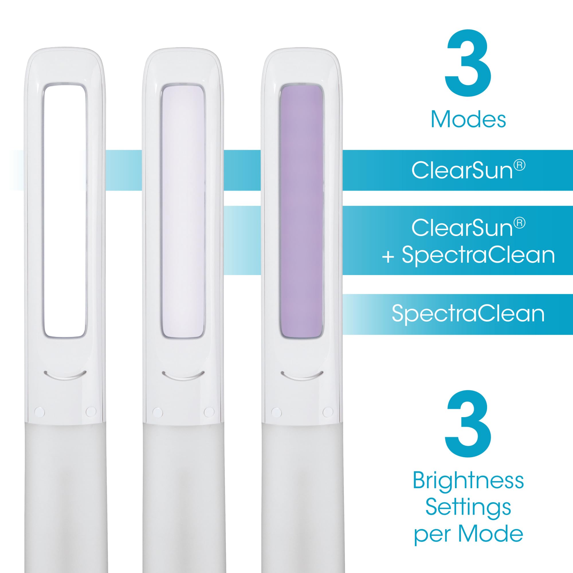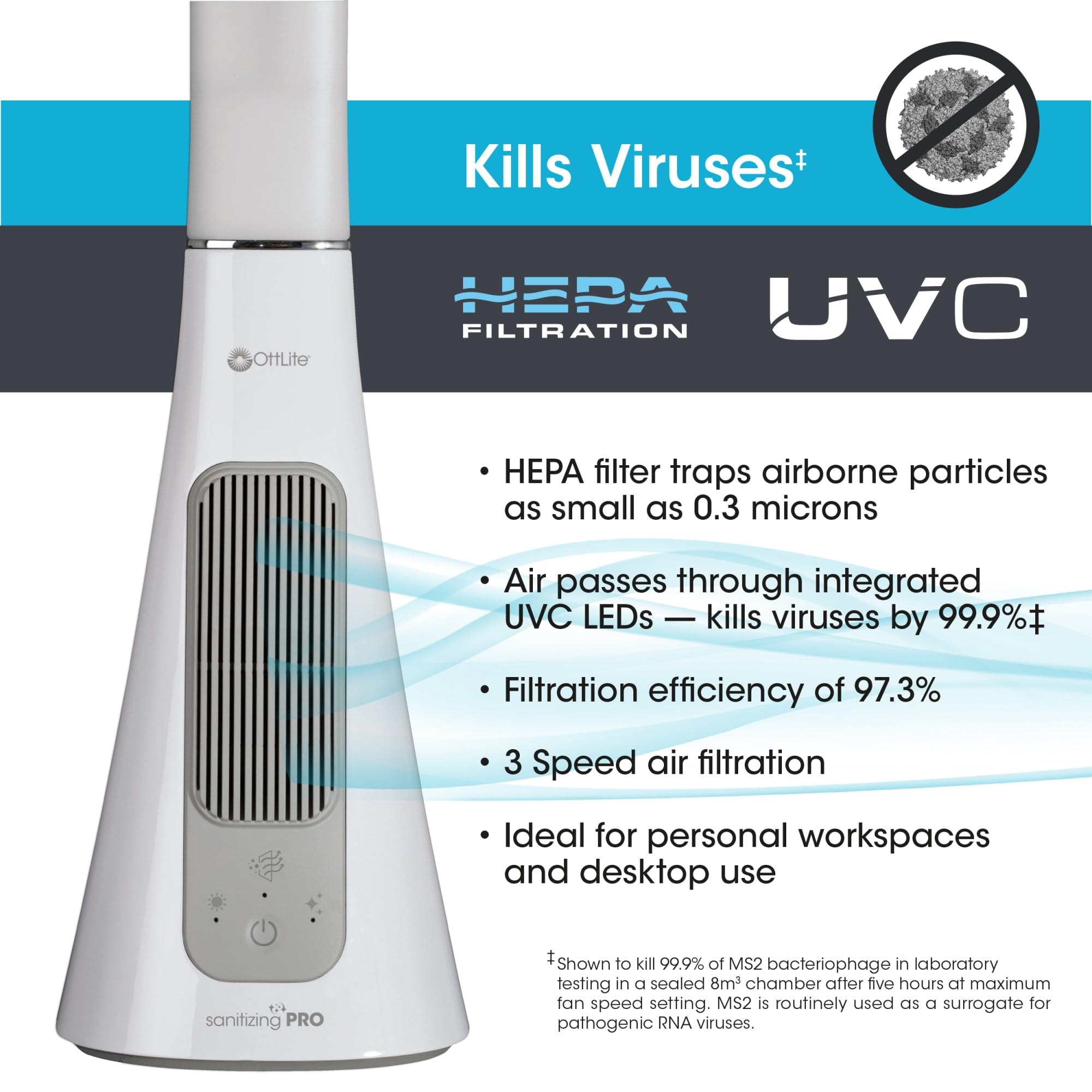 Details: Sanitize your workspace while brightening it with this OttLite Wellness Series SanitizingPro LED Desk Lamp. This table lamp offers 3 different sanitizing techniques for a more hygienic office. ClearSun LEDs help reduce glare and eyestrain for a comfortable workspace. SpectraClean LED technology minimizes on high-touch surfaces. UVC LEDs reduce and viruses. Air purifier with HEPA filter traps airborne contaminants. Touch controls enable easy use. Assembly required. Energy efficient - designed to use less energy than alternative products, potentially helping you save money and reduce your carbon footprint.