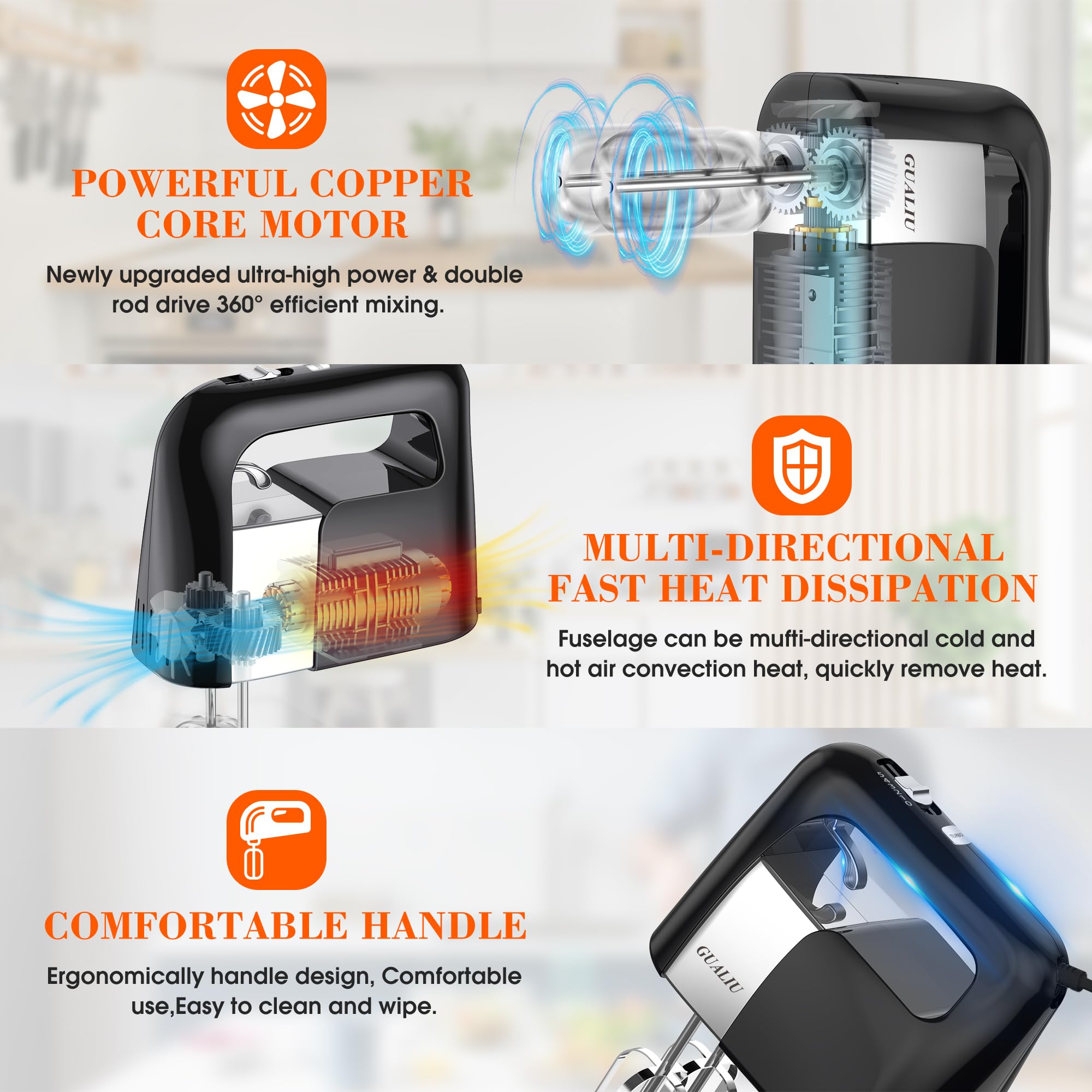 ๐๐ฌ๐ญ ๐๐๐๐ญ ๐๐ข๐ฌ๐ฌ๐ข๐ฉ๐๐ญ๐ข๐จ๐งใ Our 5-speed hand mixer electric handheld is ideal for light mixing to powerful whipping. 450-Watt pure copper motor electric hand mixer provides quiet operation and the double cooling design dissipates heat quickly for longer life. โTURBOโ feature increases power for a more enjoyable baking experience. ๐ใ๐๐จ๐ญ๐ใ- Our cake mixer comes with a cord. When using the whisk, please start at a low speed.