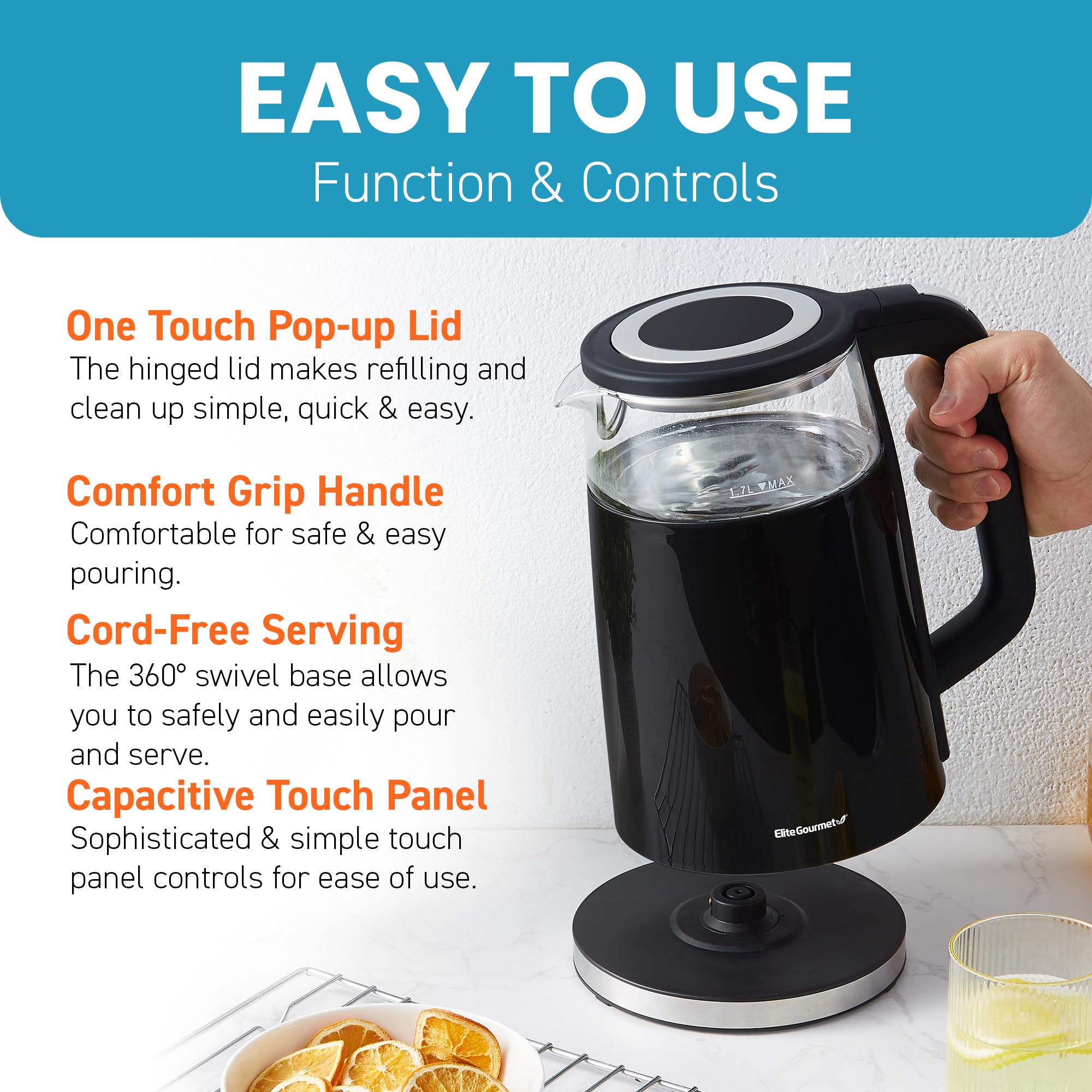 - BPA FREE: The Elite Gourmet Touch-Screen Electric 1.7L Water Kettle has a premium #304 food-grade stainless-steel interior, cordless base and BPA-free parts that heat water at the touch of a button.