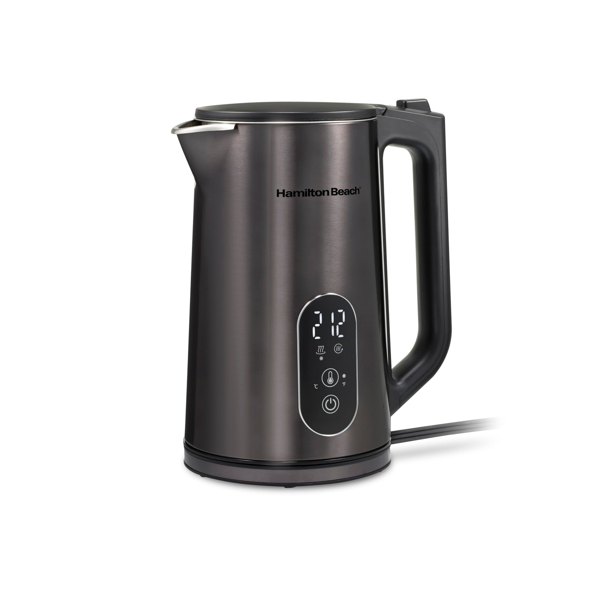 Details: With 2 layers of stainless steel, the Hamilton Beach® Digital Temperature-Control Double-Wall Kettle keeps water warm 2x longer* after it shuts off. The kettle holds 1.7 liters and has a large display, digital controls and 5 temperature presets.