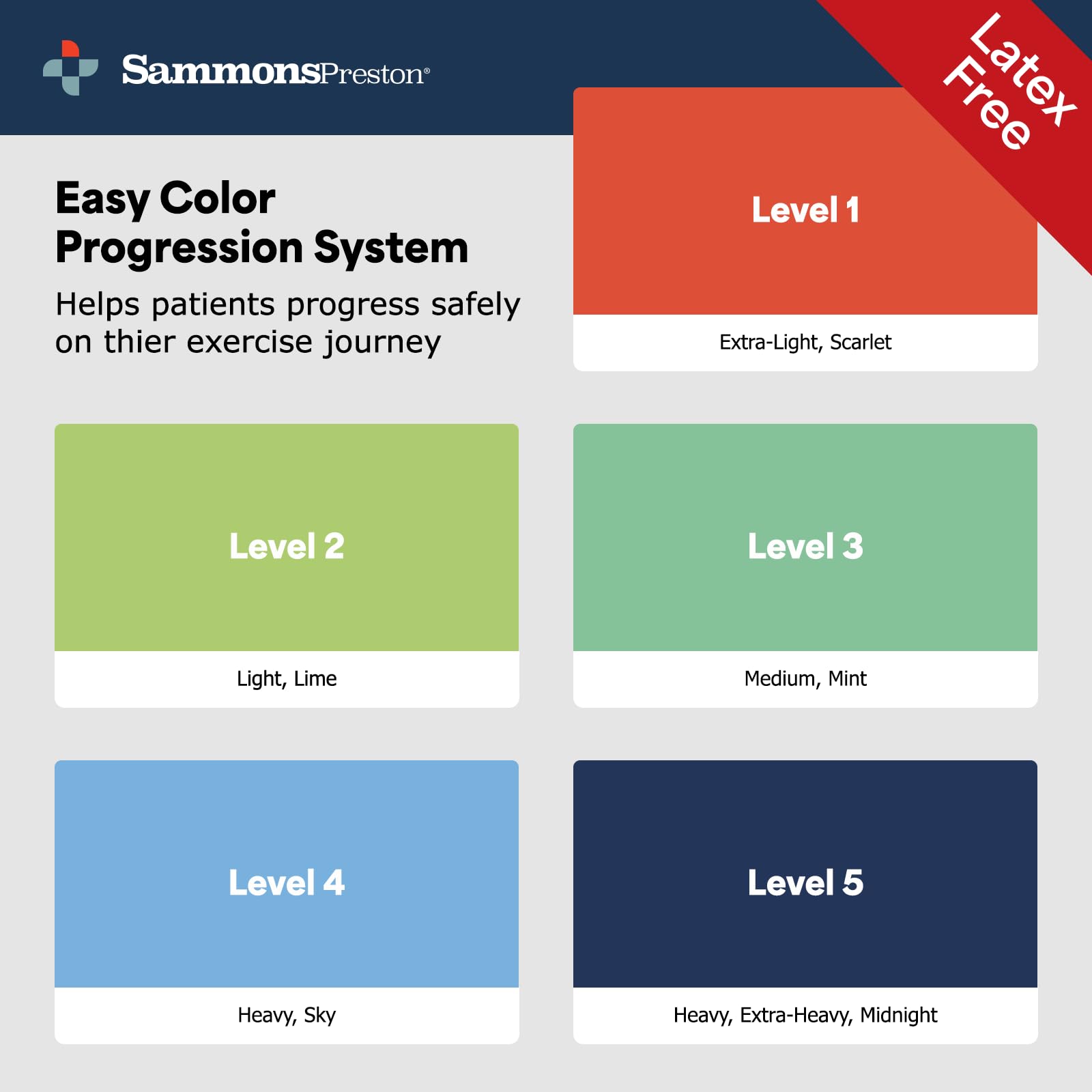 • The value priced pack in five increasing resistance levels, supports progressive exercise and advancement to the next level when you are ready.