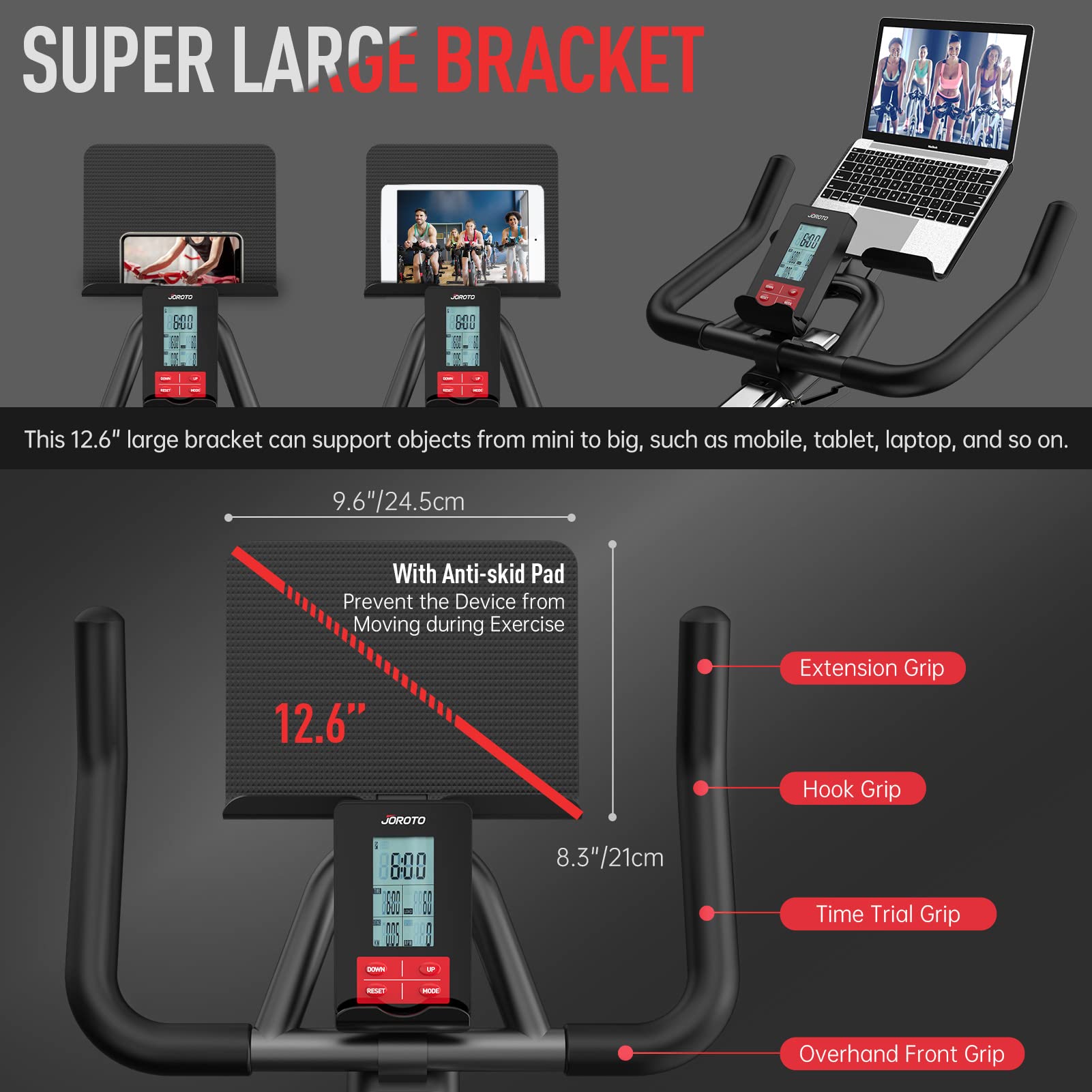 - 【Unique Updated Designs】- ① Unique 12.6” enlarged tablet bracket, it can support objects from mini to big such as mobile, water bottle,books, tablets, and laptops; ② Unique resistance and urgent stop system, 5 stronger magnets to create magnetic resistance and extra leather brake pad to make urgent stop safer, and won’t affect the magnetic resistance in the normal cycling workout.