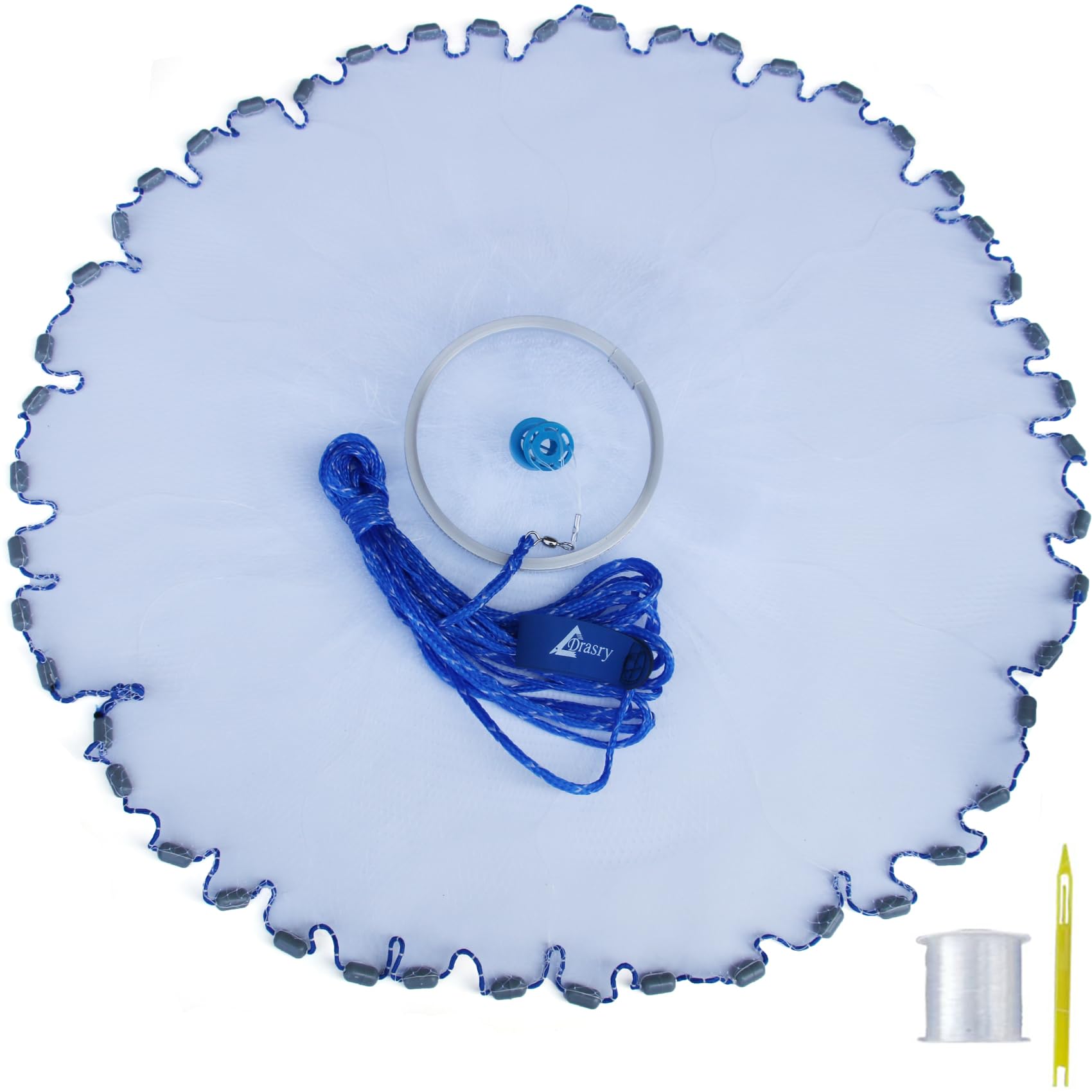 - đ Aluminum ring design makes the cast net easier to cast, even if you are a beginner, you can easily learn to catch more live bait. (Beginners please watch the main picture cast net instruction video) . 43 feet long braided polyethylene hand line can be used to catch fish in deeper water, also the length can be adjusted according to the environment you are using to avoid insufficient hand line.