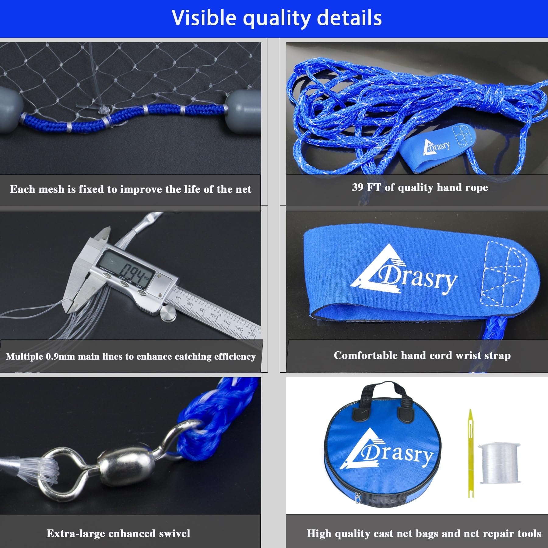 - đ The cast net is easy to cast, with a long casting distance, high casting accuracy, and fast sinking speed to ensure a good catch. Comes with repair line and repair tool to keep you fishing longer. Comes with a portable handheld cast net bag, easy to carry and store when you are out fishing.