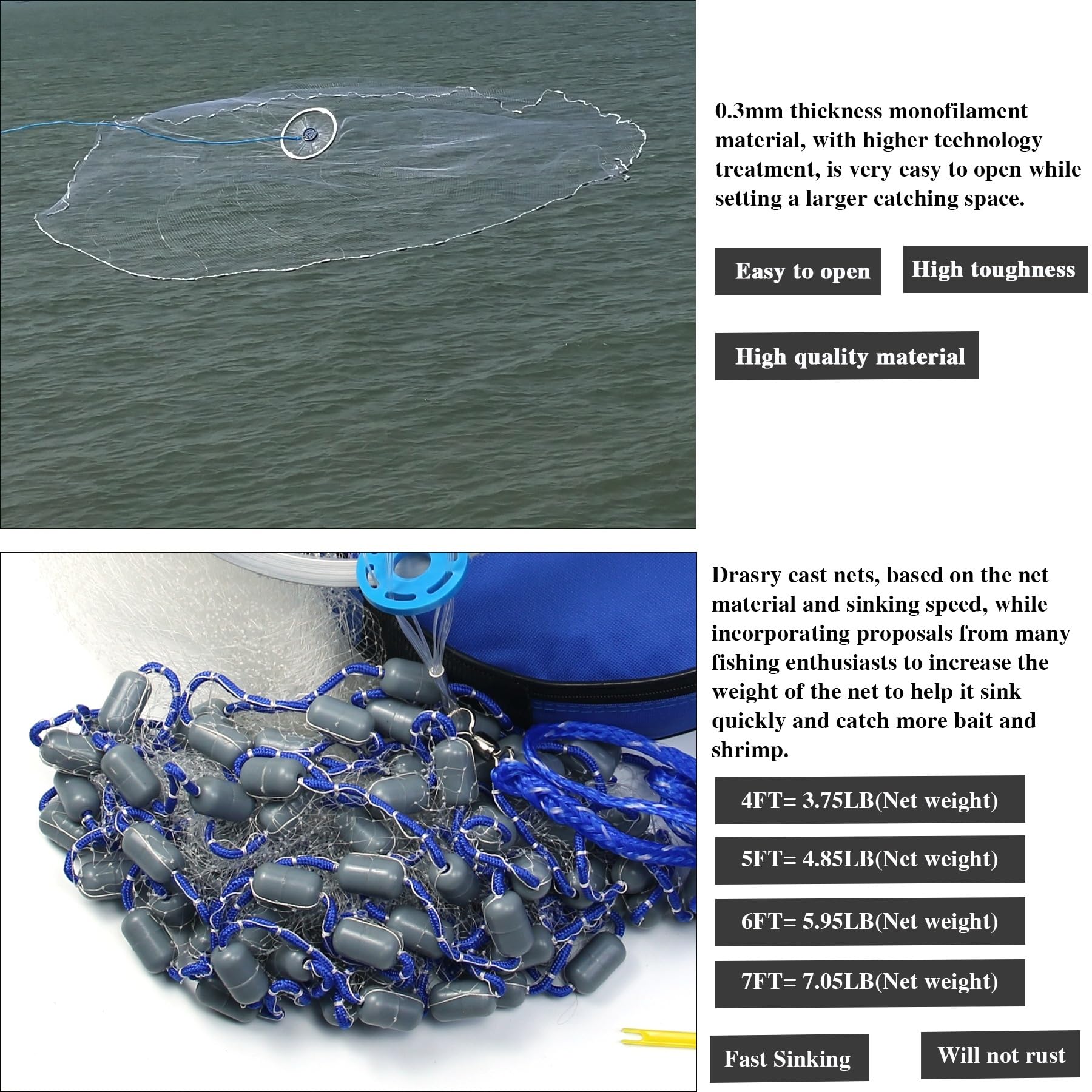 - đHANDMADE: Made of 0.3mm thickness monofilament material Prepared as 3/8 mesh and treated with fluffing technology to make the cast net easier to open and cast. Quality craftsmanship and materials make it a must-have for anglers.