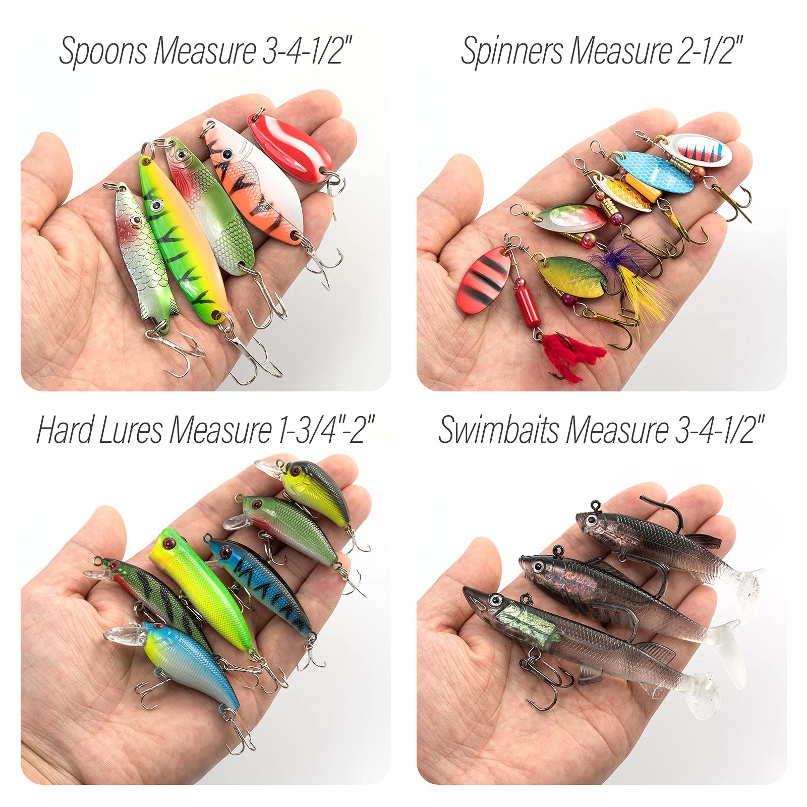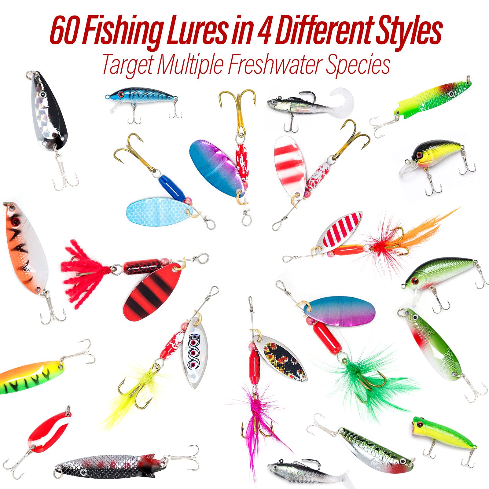 - 100% Full Lure Kit: A 60 pieces HUGE quantity fishing lure kit with 5 tackle boxes that includes almost every type of lures you need. This assortment includes 40 spinner baits, 8 fishing spoon lures, 6 soft swimbaits, 5 crankbaits and 1 popper.