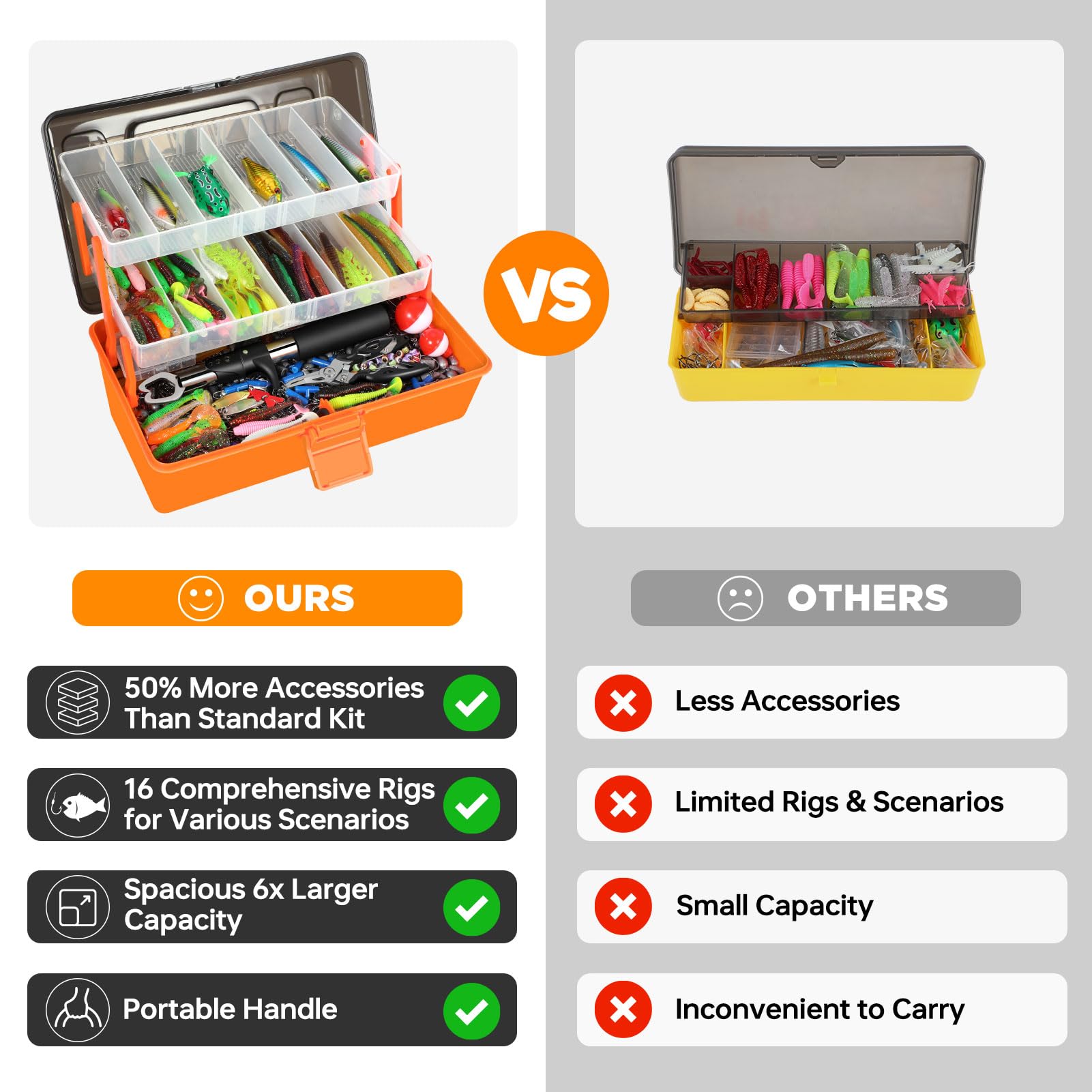 - 【Comprehensive Fishing Kit】 - It's a complete package with essential tools like pliers and a fish gripper, plus a full set of fishing accessories. It simplifies preparation, making fishing more hassle-free for impromptu trips. The tackle box with tackle included 1 plier and gripper, 2 crankbaits, 1 popper, 1 minnow, 1 pencil, 1 frog, 36 soft lures, and a box of 100 fishing hooks. It also features 40 offset worm hooks, 13 jig heads, 79 weights, and more to cater to diverse fishing needs.