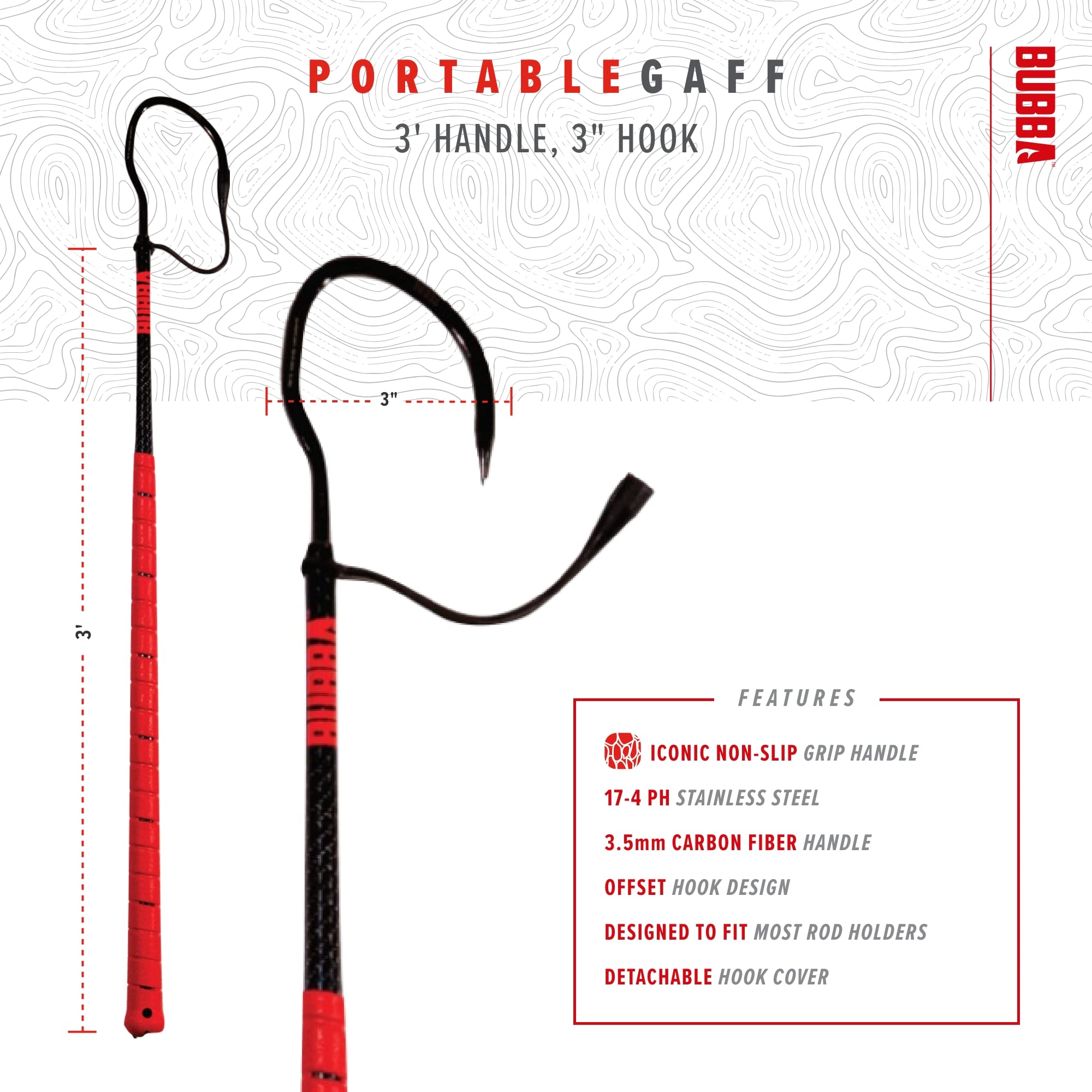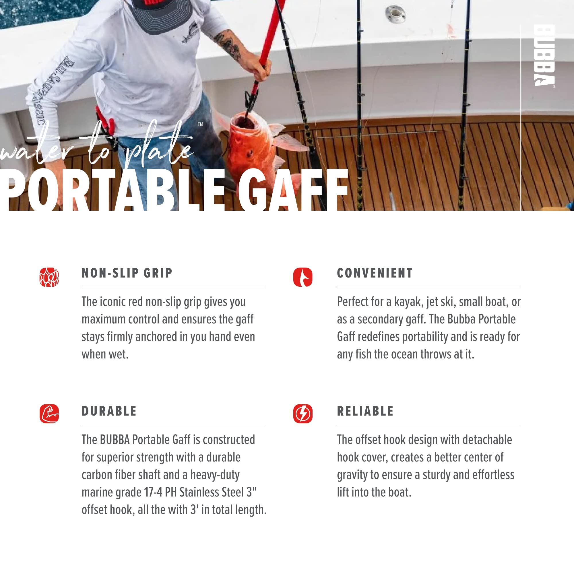 Details: All-new to the Bubba Carbon Fiber Family of Gaffs is our Portable Gaff. This Gaff is designed to be used for kayaks, small boats or as an secondary gaff when bringing in large fish. As with all of our gaffs, we engineered them with a carbon fiber shaft for ultimate strength and a lightweight hold. Our 17-4 PH stainless steel, offset hook offers maximum control when bringing in fish. The Bubba Portable Gaff is built with the same iconic, non-slip grip handle for complete security