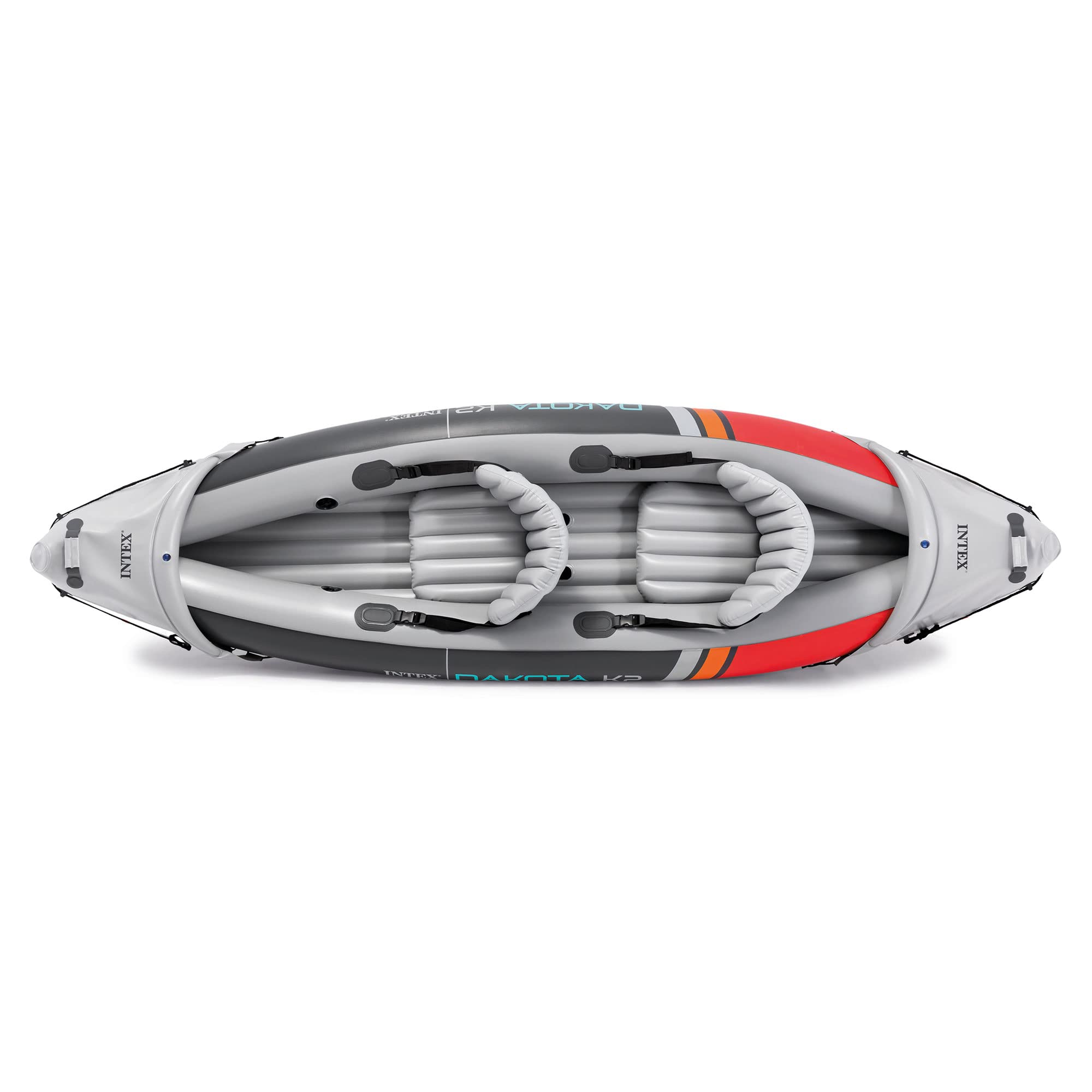 Details: Experience the tranquility of the great outdoors with the Intex Dakota K2 2-Person Vinyl Inflatable Kayak. This foldable kayak is ideal for camping and fishing enthusiasts. Crafted from durable vinyl, it ensures longevity, and its inflatable design enables easy storage and transportation. The package includes oars and an air pump, making it a comprehensive choice for your boating adventures. For added comfort during extended paddling sessions, an adjustable boat seat is also included. The Intex Dakota K2 is suitable for a solo adult, but it can comfortably accommodate up to two individuals with a maximum capacity of 400 pounds. It even comes with a convenient carry bag to store your fishing gear and other kayak accessories. The kit provides an air pump for effortless inflation and deflation. This inflatable kayak is an essential addition to your camping gear for all water sports adventures. Whether you're fishing, kayaking, or simply enjoying the water, this kayak ensures your participation with ultimate comfort and convenience. The Intex Dakota K2 combines the practicality of a folding kayak with the convenience of a paddleboard that can be disassembled for easy storage. In essence, the Intex Dakota K2 is more than just a kayak; it's a complete package that allows you to savor your water sports fully. It's not just a product; it's a lifestyle.