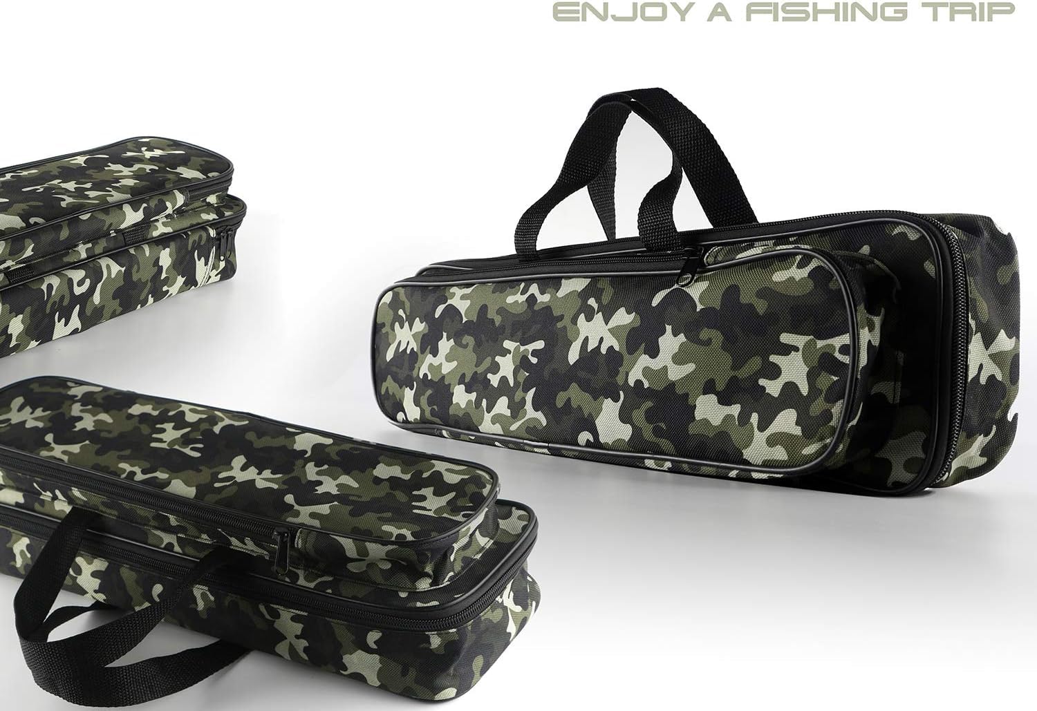 - FISHING ACCESSORIES: Lures are packaged in a plastic box include: 30 Pcs soft lures and 6 jig head hooks, suitable for fishing in different waters. The waterproof camo fishing bag is made of high quality nylon, large capacity allows to load more tools you need and carry everywhere you want to fishing