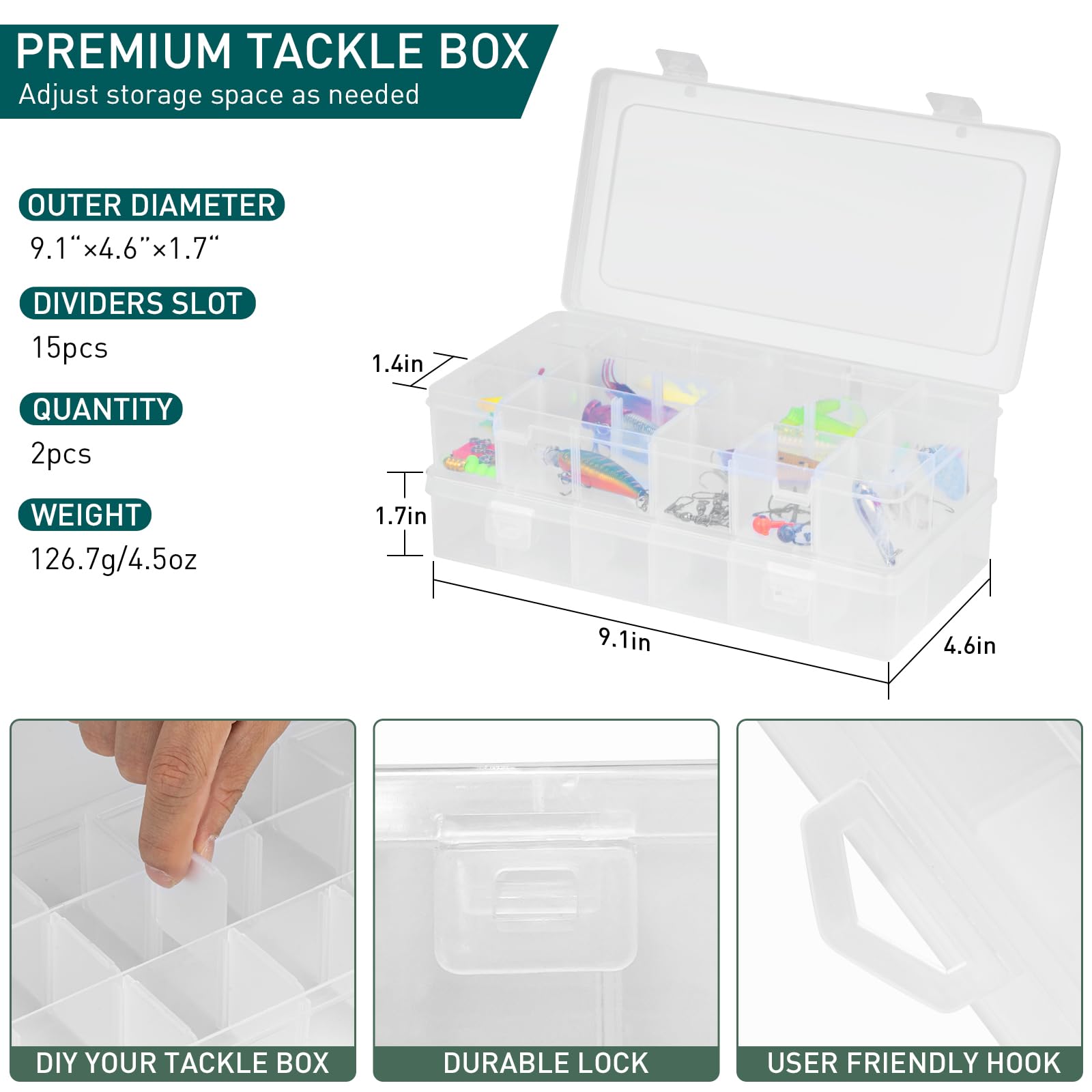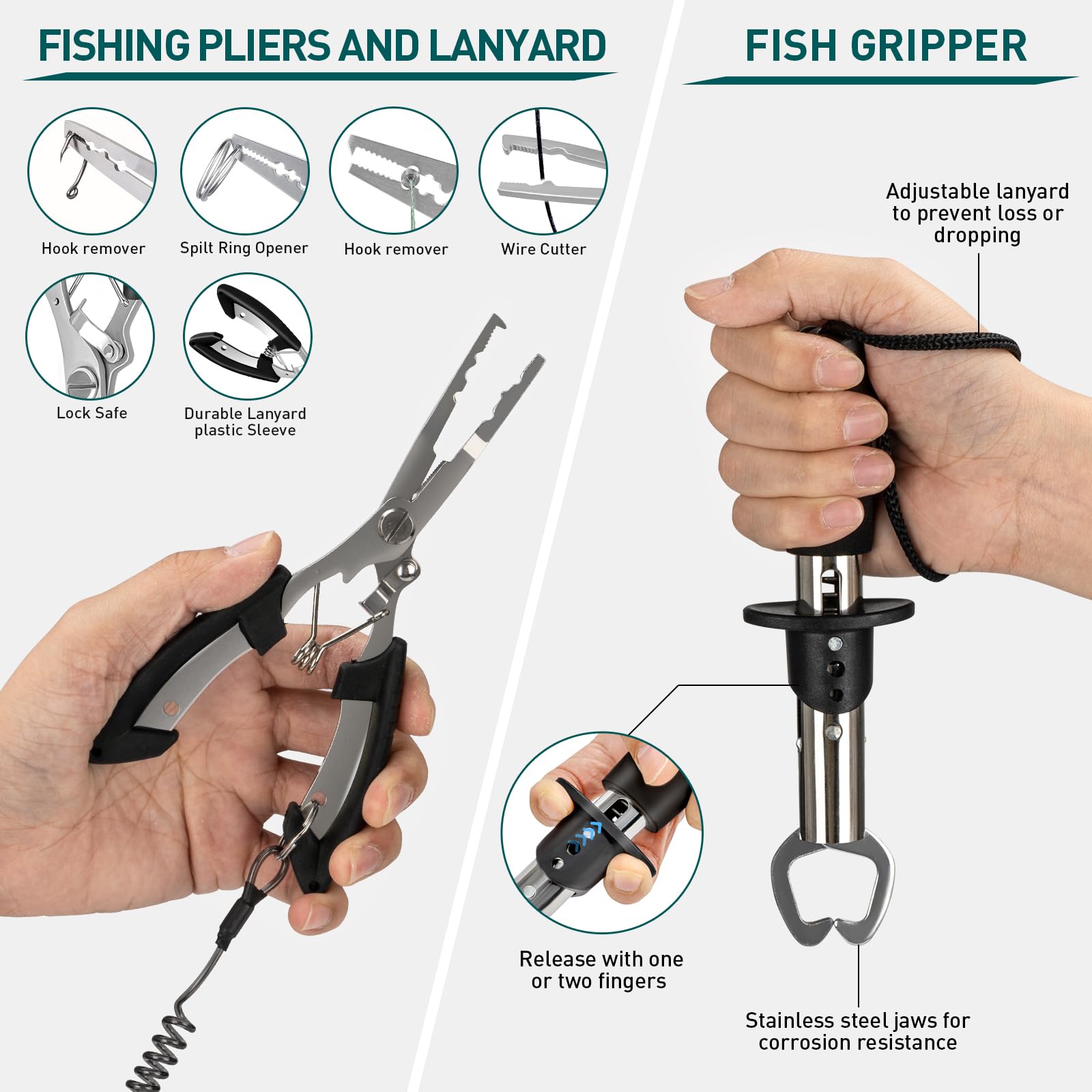 - Practical Fishing Tackle Kit: Our set includes a fish pliers kit, which is widely used for separating rings, removing hooks, cutting lines and adjusting baits. It also includes 2 adjustable fishing tackle boxes, the partitions can be flexibly adjusted to store various baits, fish hooks or other small items, making your fishing trip more convenient. It is an fishing kits for adults essential tool.