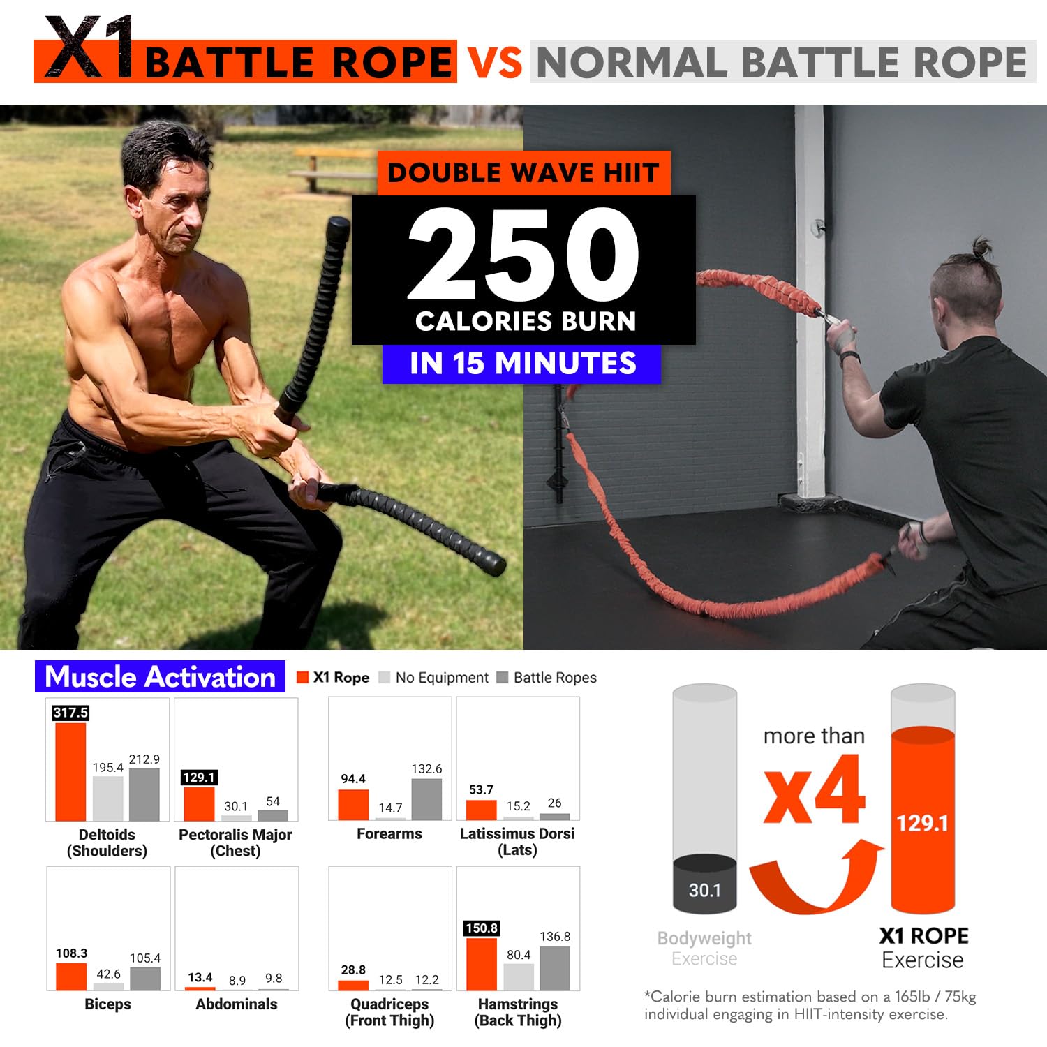 • ✅ 『Workout Anywhere, Anytime』 No bulky ropes, no noise, no setup. Train at home, in the park, or even in a hotel room—HIIT workouts have never been this convenient. The X1 ropeless battle rope is the perfect space-saving alternative to traditional workout ropes.