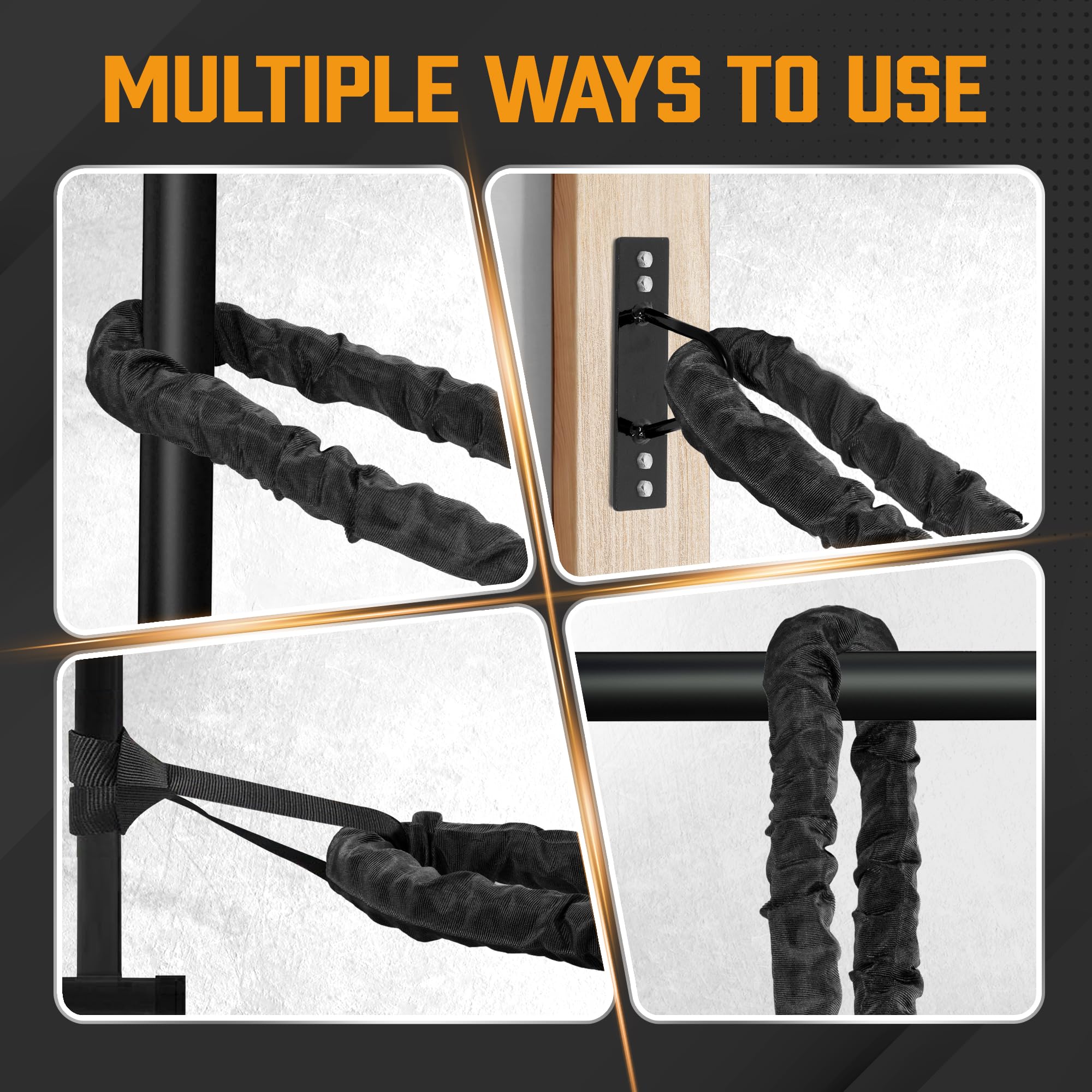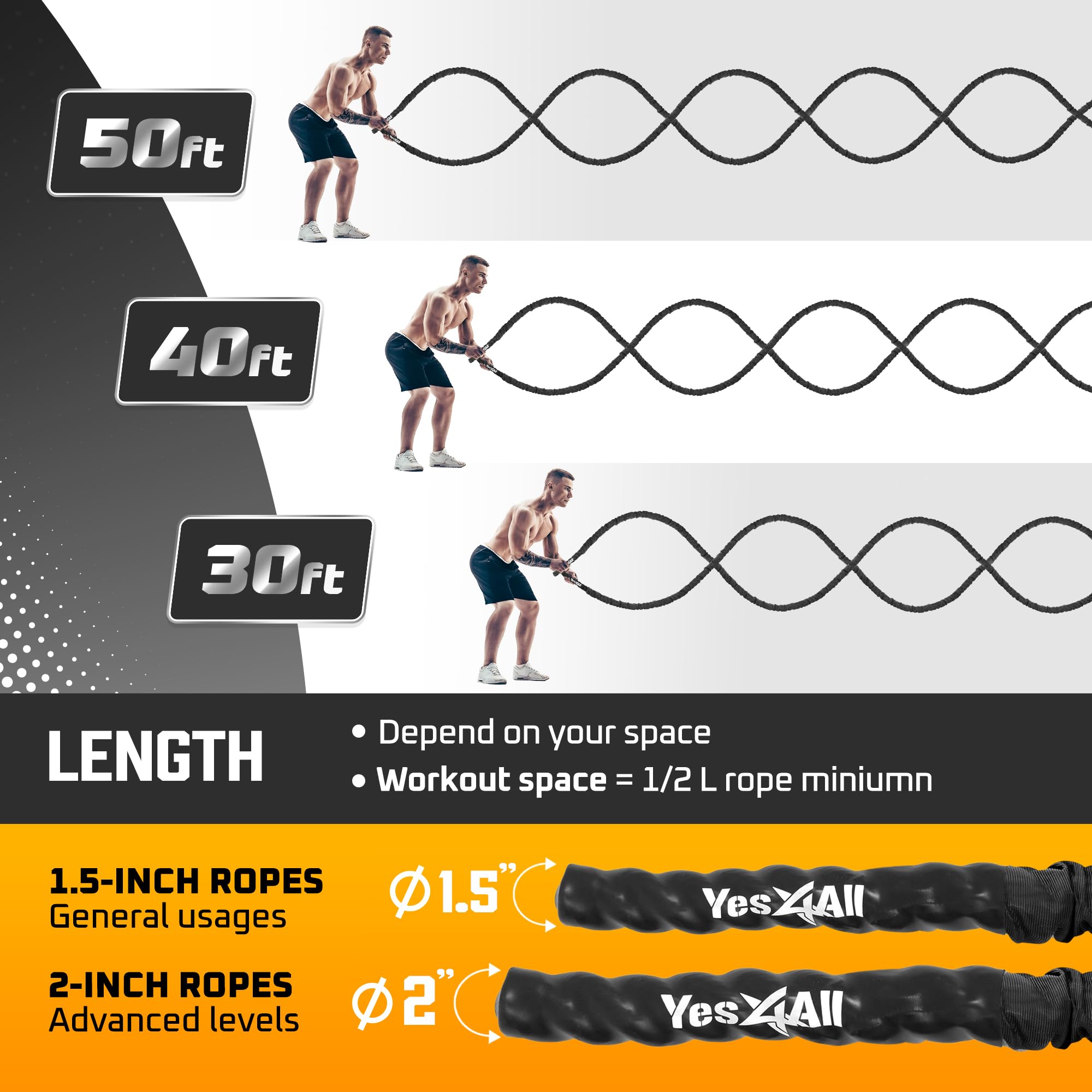 • FIT FOR ALL LEVEL: Our heavy duty battle ropes are available in 1.5/ 2 in diameters, with lengths of 30/40/ 50 feet, ideal for all fitness levels; The battle ropes for home workout are suited for intense training, intermediate to advanced users