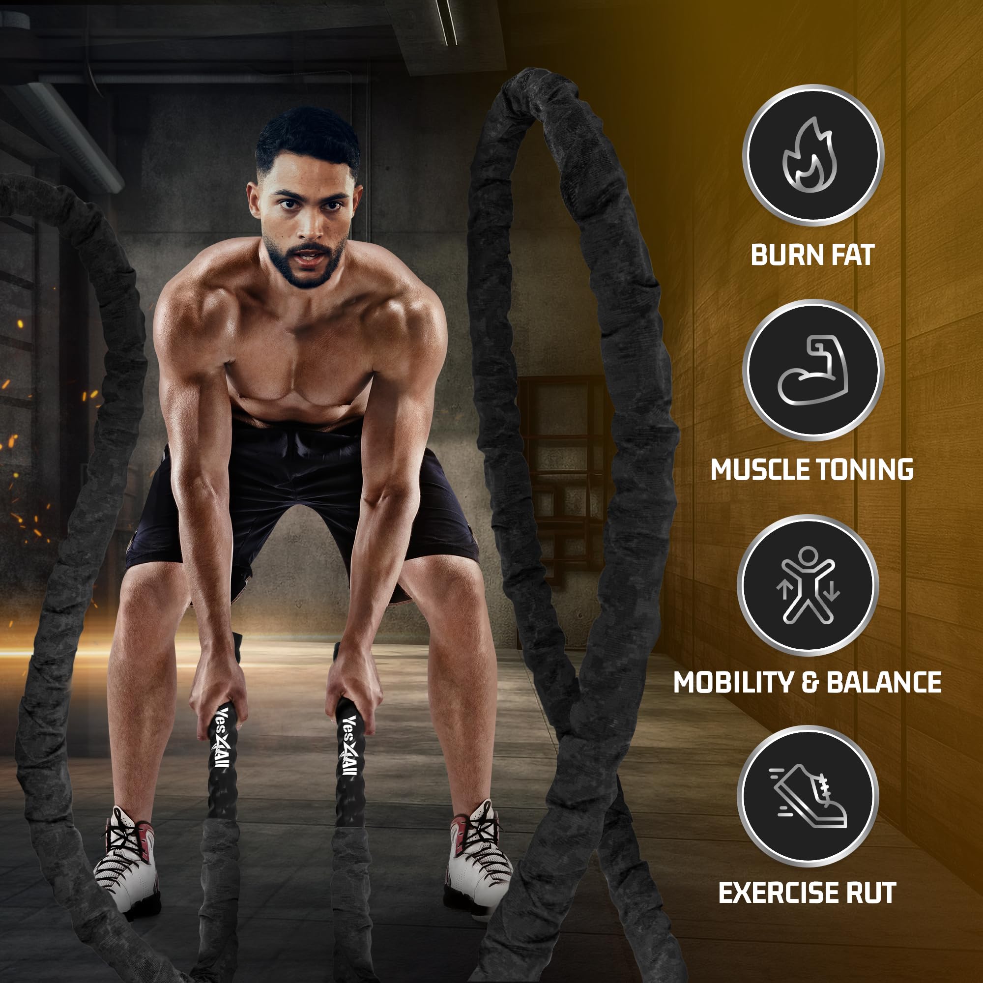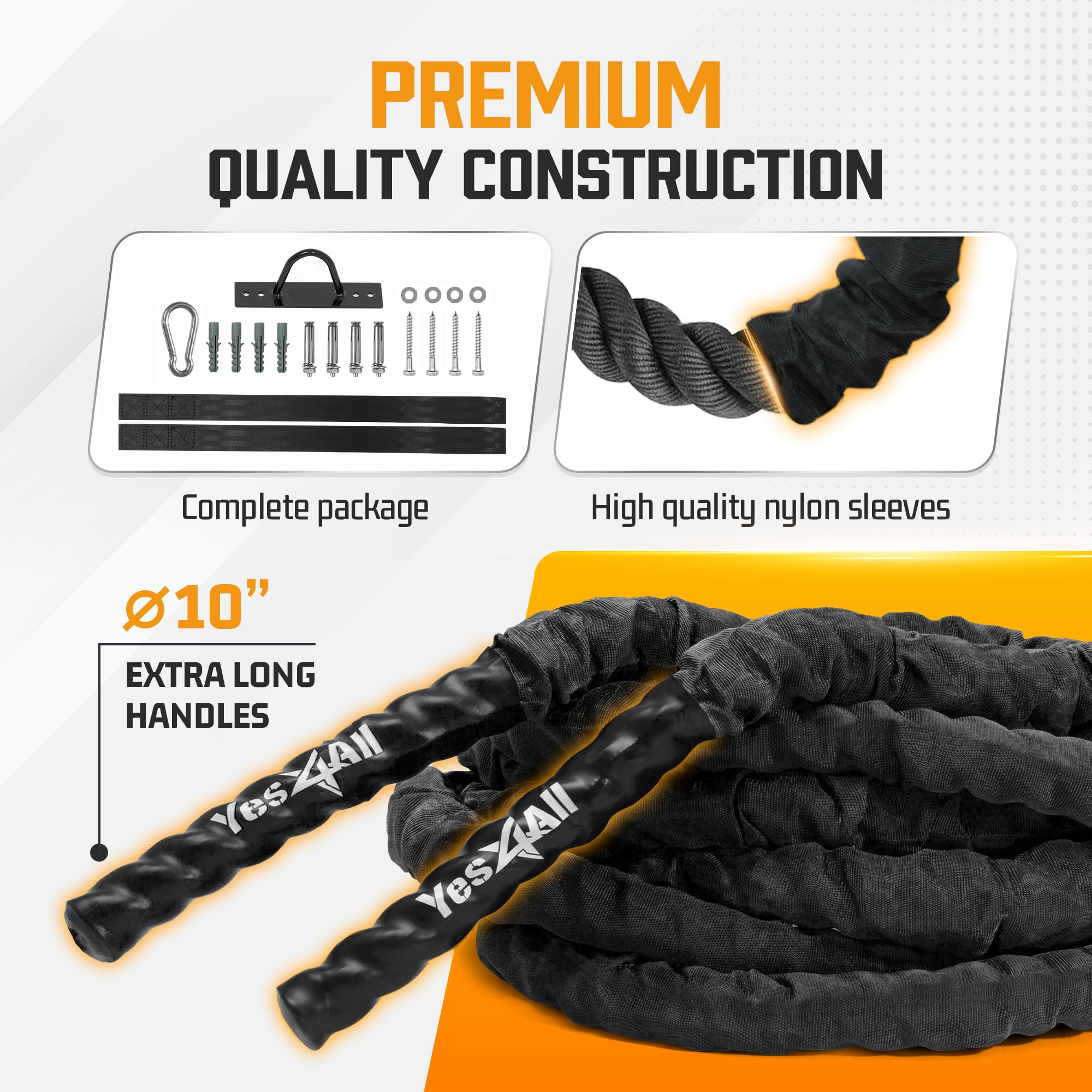 • SECURE GRIP HANDLES: Featuring 10-inch long handles, a non-slip grip, and heat shrink material, this battle rope workout ensures hand protection during strength training; Our outdoor battle ropes are ideal for home gym training, fitness exercises