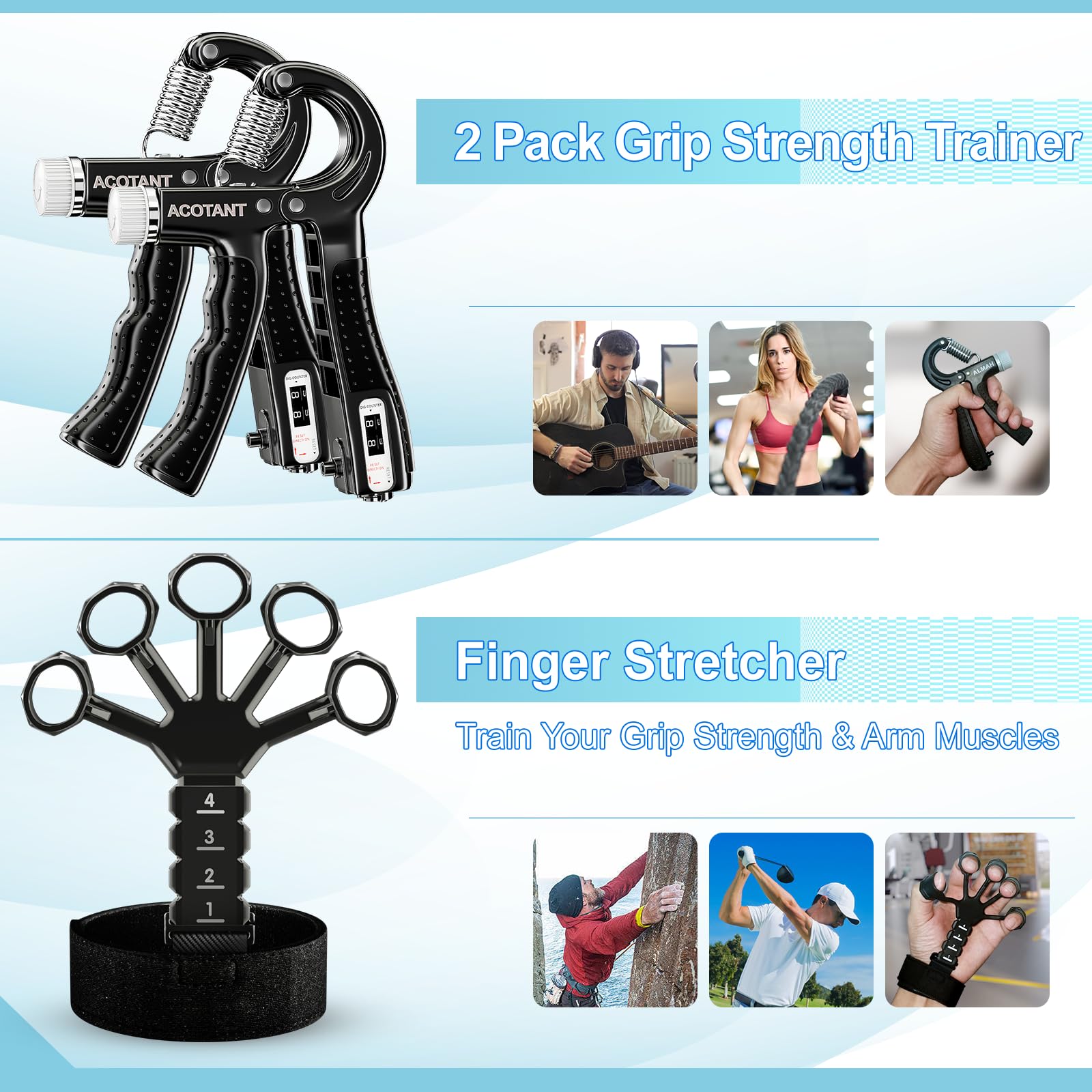 Acotant Grip Strength Trainer(5 Pack) with Finger Exerciser, Hand Grip Strengthener, Finger Stretcher,Grip Ring & Stress Relief Ball for Muscle Building and Injury Recover with Carry Bag