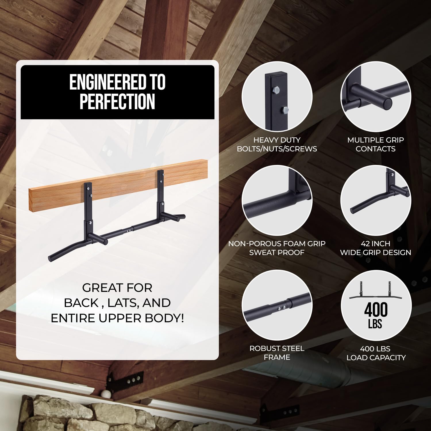 • Extra-wide 42" grip bar: Experience superior grip and comfort with a full 42" wide bar featuring a 1 1/4" padded diameter, designed to provide a secure and solid feel during your workouts.