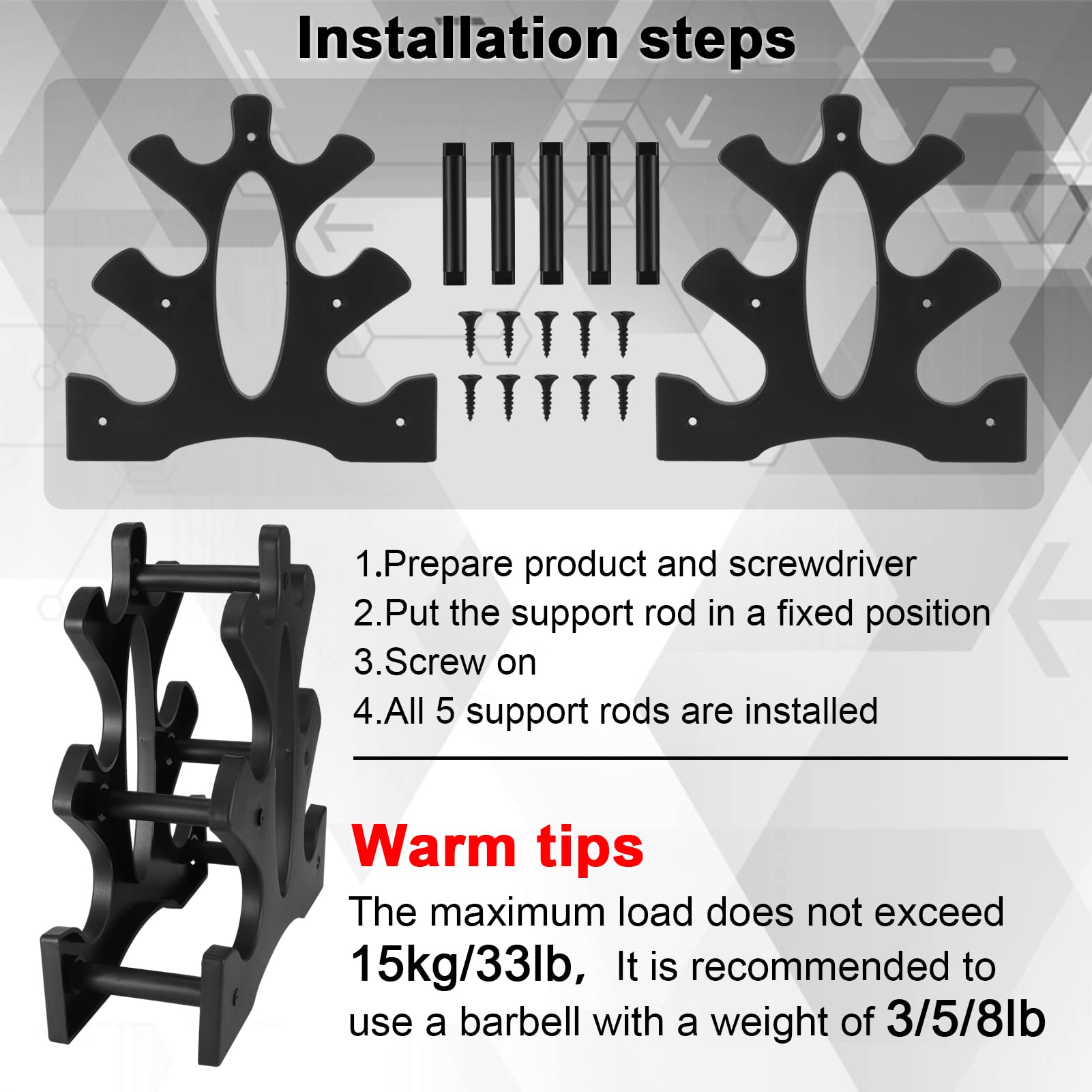 • Ergonomically: The 3-tier dumbbell storage design adopts a three-dimensional tripod design, hold 3/5/8 LB (1.36/2.27/3.63 kg)weight, the rack has an ergonomically and has stable functions, small and exquisite, easy to receive and carry