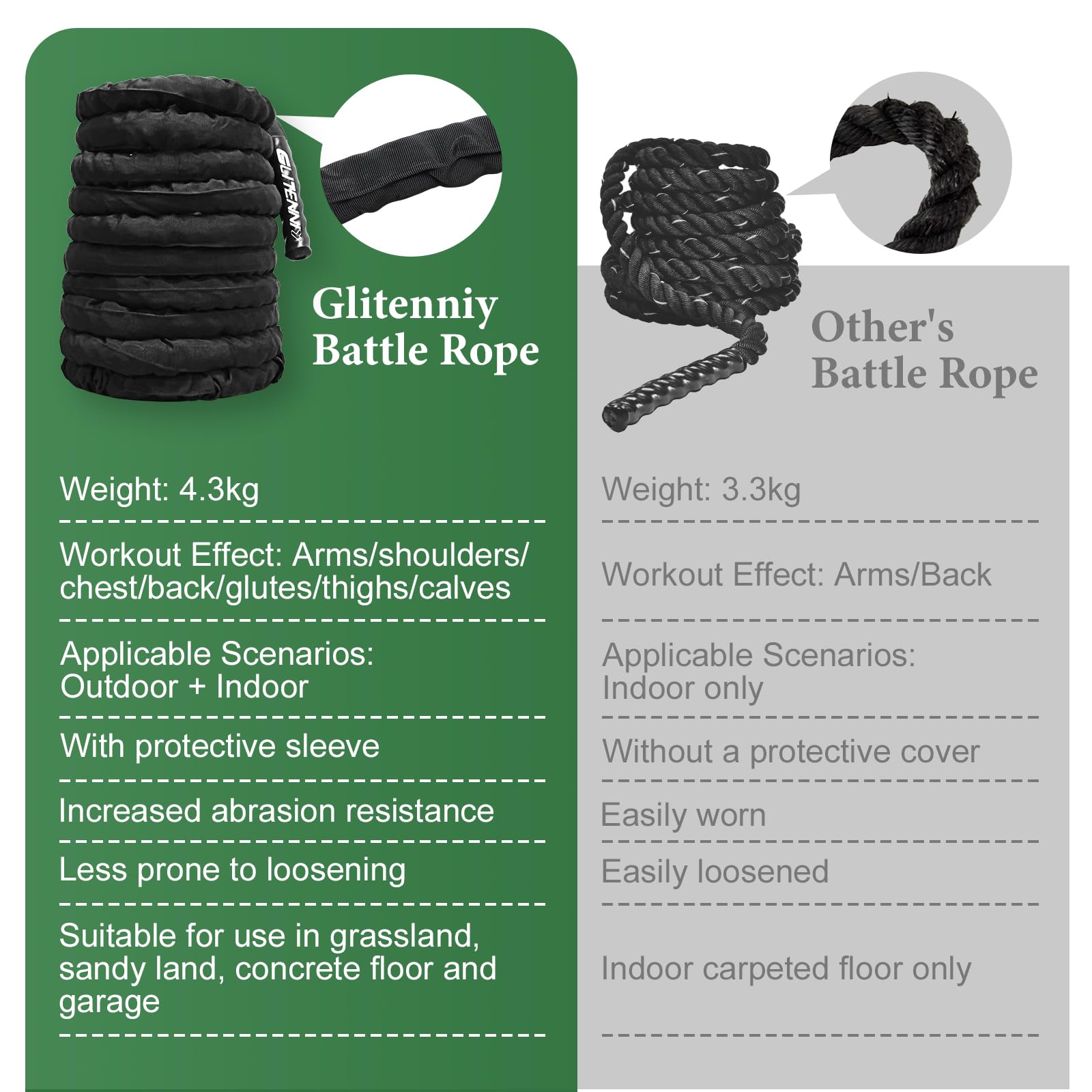 • Gym Rope with Protective Sleeve: The nylon protective sleeve protects theexercise rope from friction damage and ensures a durable product. Weighted ropes for exercises is made of 3 strands of 100% polyester fiber, which is compact, strong in tensile strength and resistant to loosening and deformation, The perfect combination of 3-strand construction and nylon protective sleeve of the workout rope makes the product more durable, so your weighted workout ropes won't start to fray and fall apart, even on concrete!