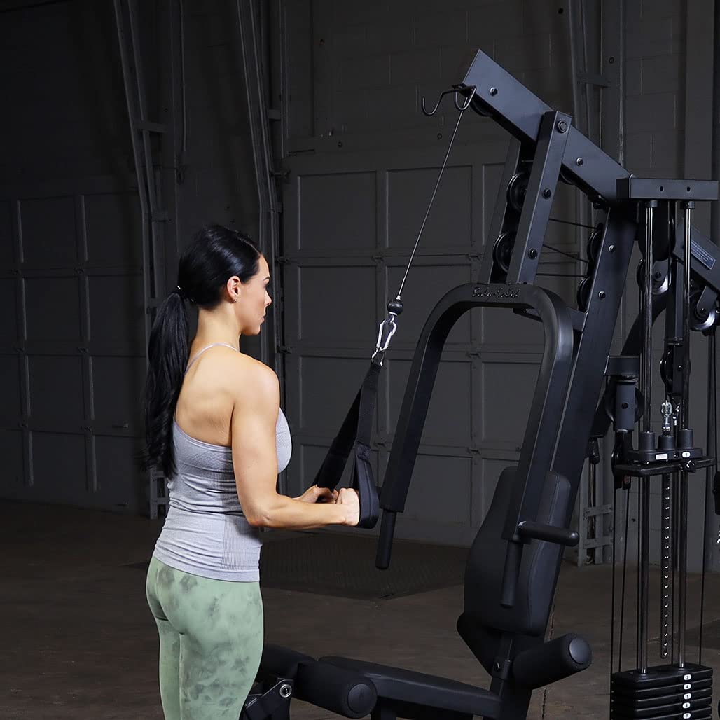 - INCLUDED ATTACHMENTS: Fully adjustable single-stack home gym workout machine featuring a no-cable change design lat pull down bar, low row bar, ab harness comfortable multi-position handgrips and adjustable hold-down pads to target several muscle groups (abs, biceps calves, delts forearms, glutes hamstrings, lats lower back, obliques pectorals, quads shoulders traps, tricepts and total body).