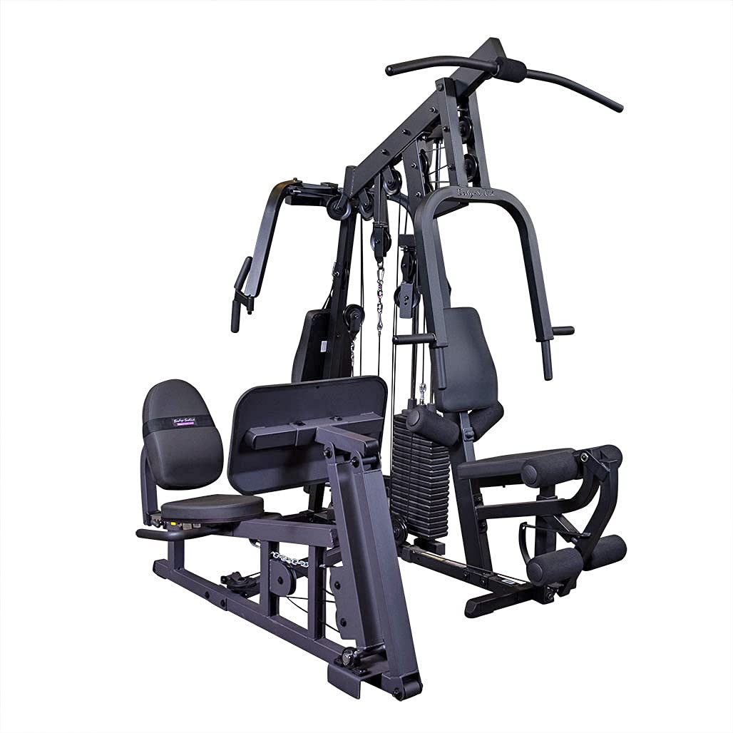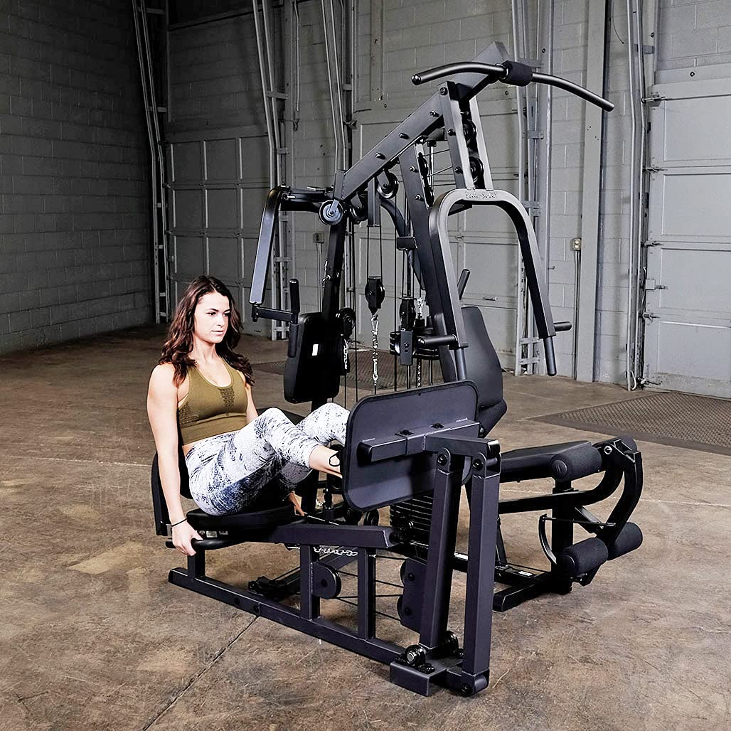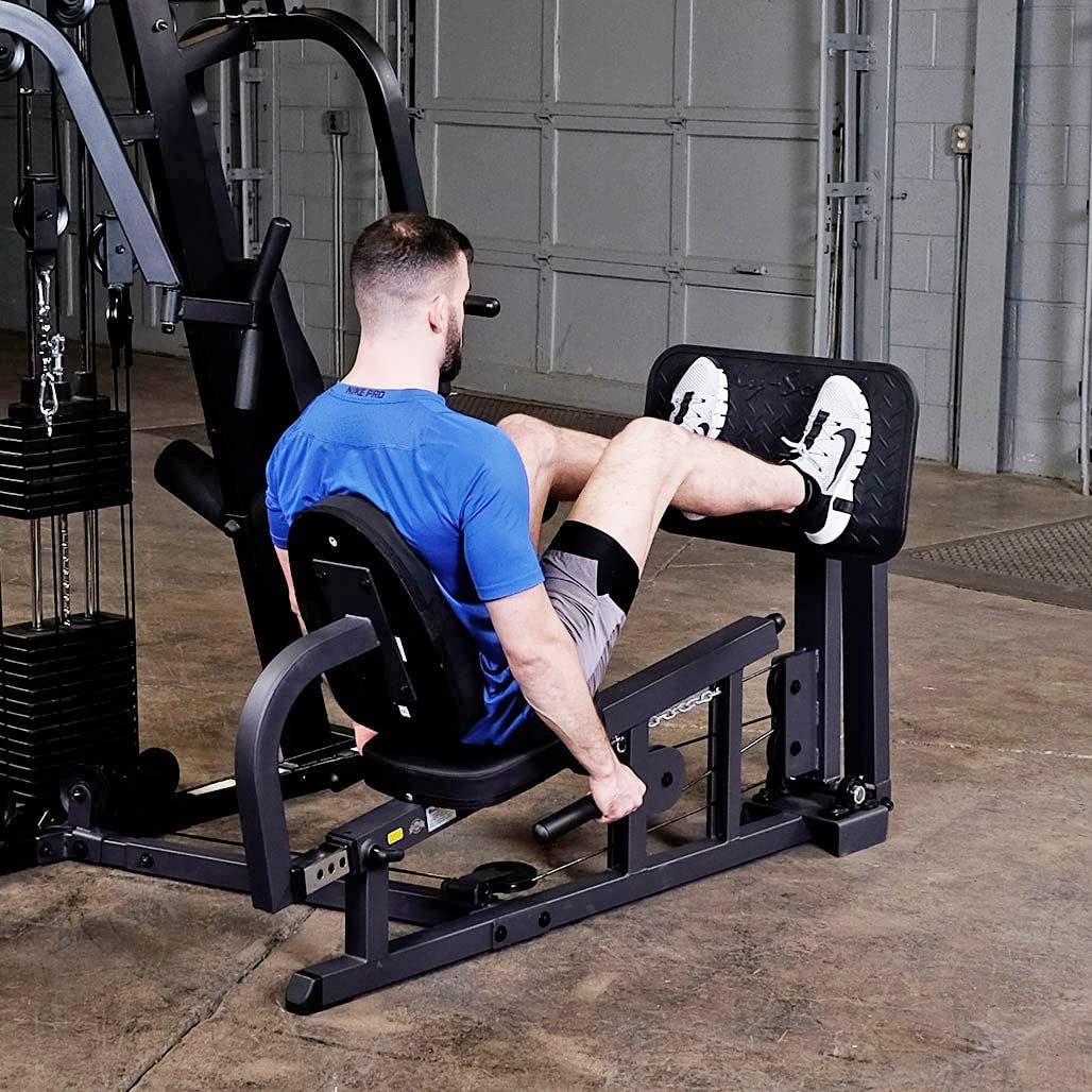 - 6 UNIQUE WORKOUT STATIONS: Multi-Press Station Lat Pulldown/High Pulley, Ab Crunch/Mid Pulley, Leg Extension/Leg Curl, Leg Press, Seated Row/Low Pulley which features a 310lbs. black cast iron plates stack with state of the art nylon bushings for smooth and quiet operation.