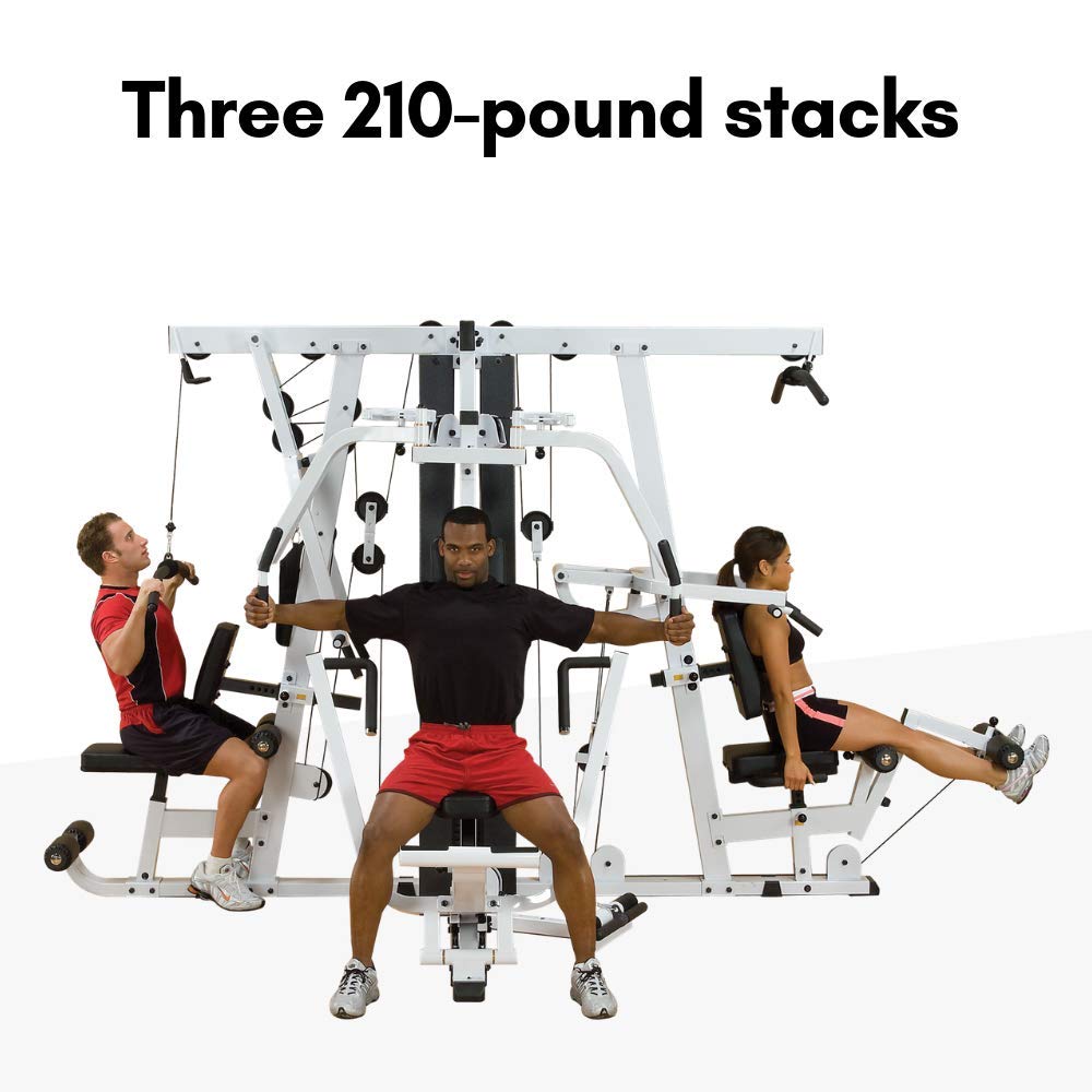 Offering an enormous range of upper and lower body exercises for maximum muscular strength, conditioning, and endurance building, the Body-Solid Triple-Stack Multi-Station Gym (EXM4000S) is the ultimate home or professional gym package. This machine allows up to three people to work out simultaneously, with exercise stations fed by three 210-pound steel alloy weight stacks. Oversized nylon bushings offer super smooth operation and sound absorbing cushioning while you lift.