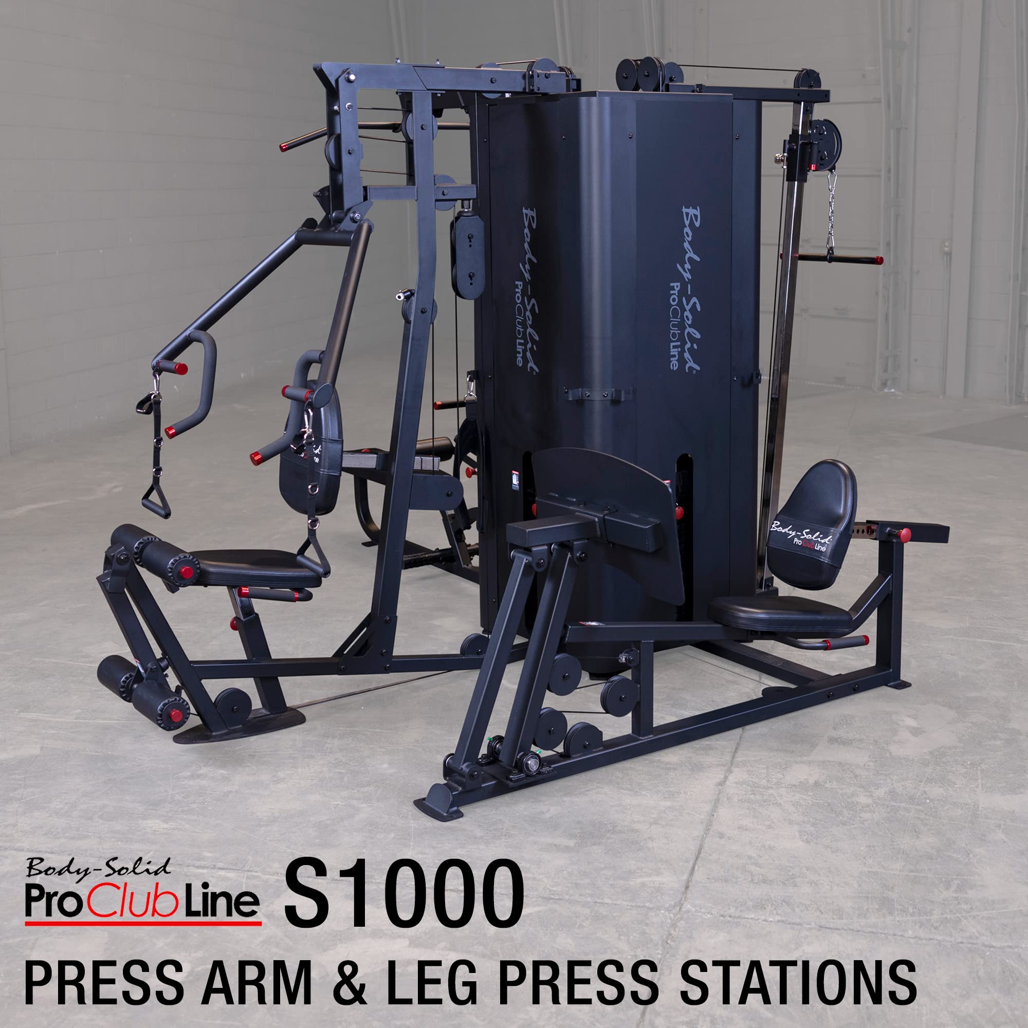 Details: The Body-Solid Pro Clubline S1000 Four-Stack Gym is a full commercial multi-station gym featuring four independent, unique exercise stations and weight stacks, allowing up to four people to work out simultaneously. Meticulously crafted and designed to look great in all contemporary workout and fitness facilities, the Body-Solid S1000 features a bold matte black finish and sleek fully-shrouded weight stacks. Built with 11-gauge steel, the S1000 can hold up in heavy-use commercial and light commercial facilities. The Body-Solid Pro Clubline S1000 Four-Stack Gym is ideal for hotels, apartments, police & fire stations, schools, training facilities, and more. The four stations include an adjustable cable column, a bench press/mid row/leg extension/leg curl, lat & mid row, and leg press & calf raise. These four stations have something for everyone and offer a comprehensive total body workout. The Body-Solid Pro Clubline S1000 Four-Stack Gym comes standard with four x 210 lb. weight stacks, and each gym includes a lat bar, curl bar, ab strap, ankle strap, and two cable handles.