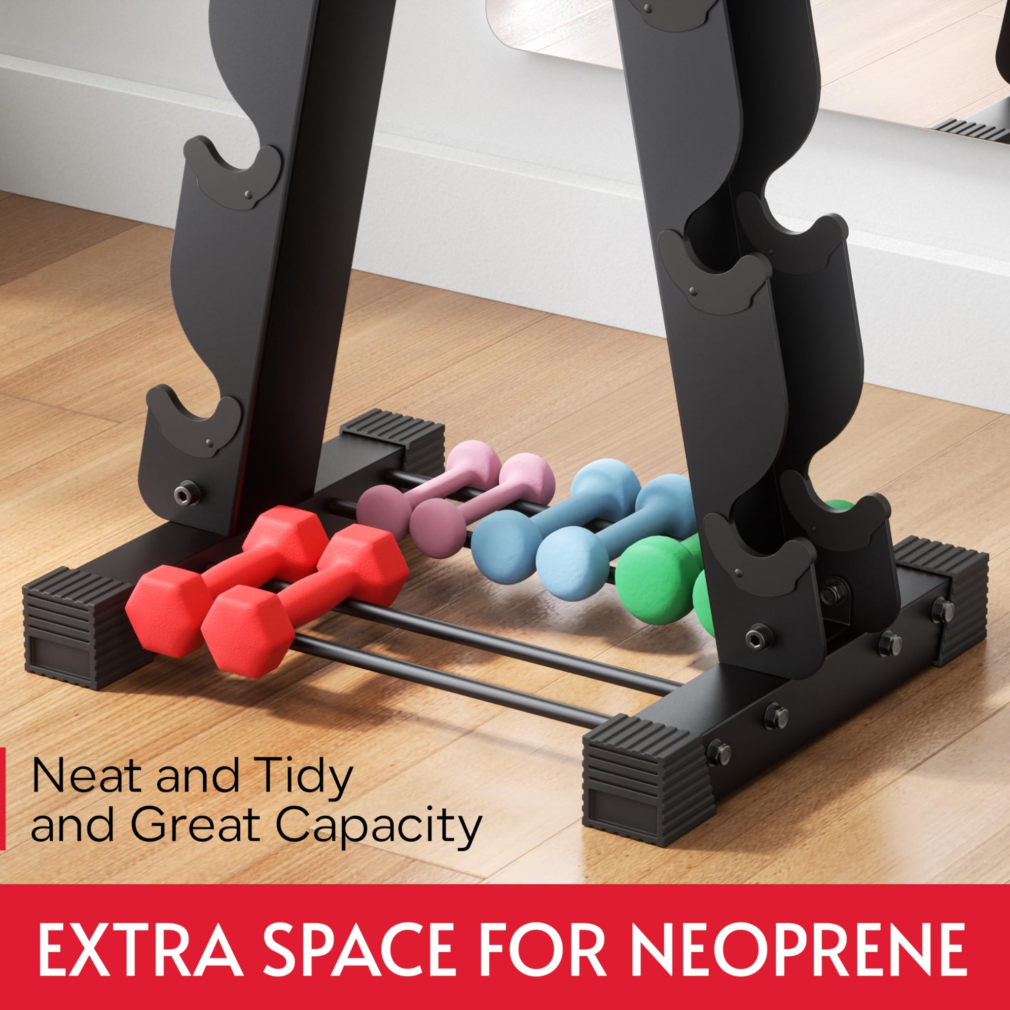 • Extra Space at Bottom for Neoprene: This weight tree rack offers ample space for organizing various dumbbells, including neoprene and kettlebells; enjoy a neat and tidy gym with all essentials impeccably arranged