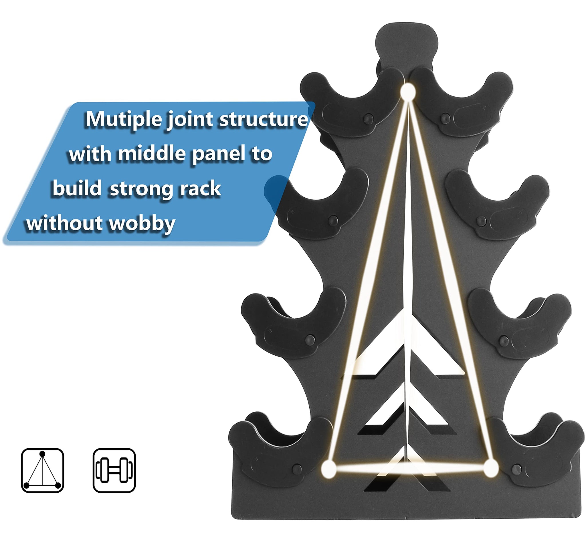 • Stable withtout any Wobble-This free weight rack feature A-shape construction with thick steel strong enough to hold 3 pair dumbell withou wobble like planted on the ground