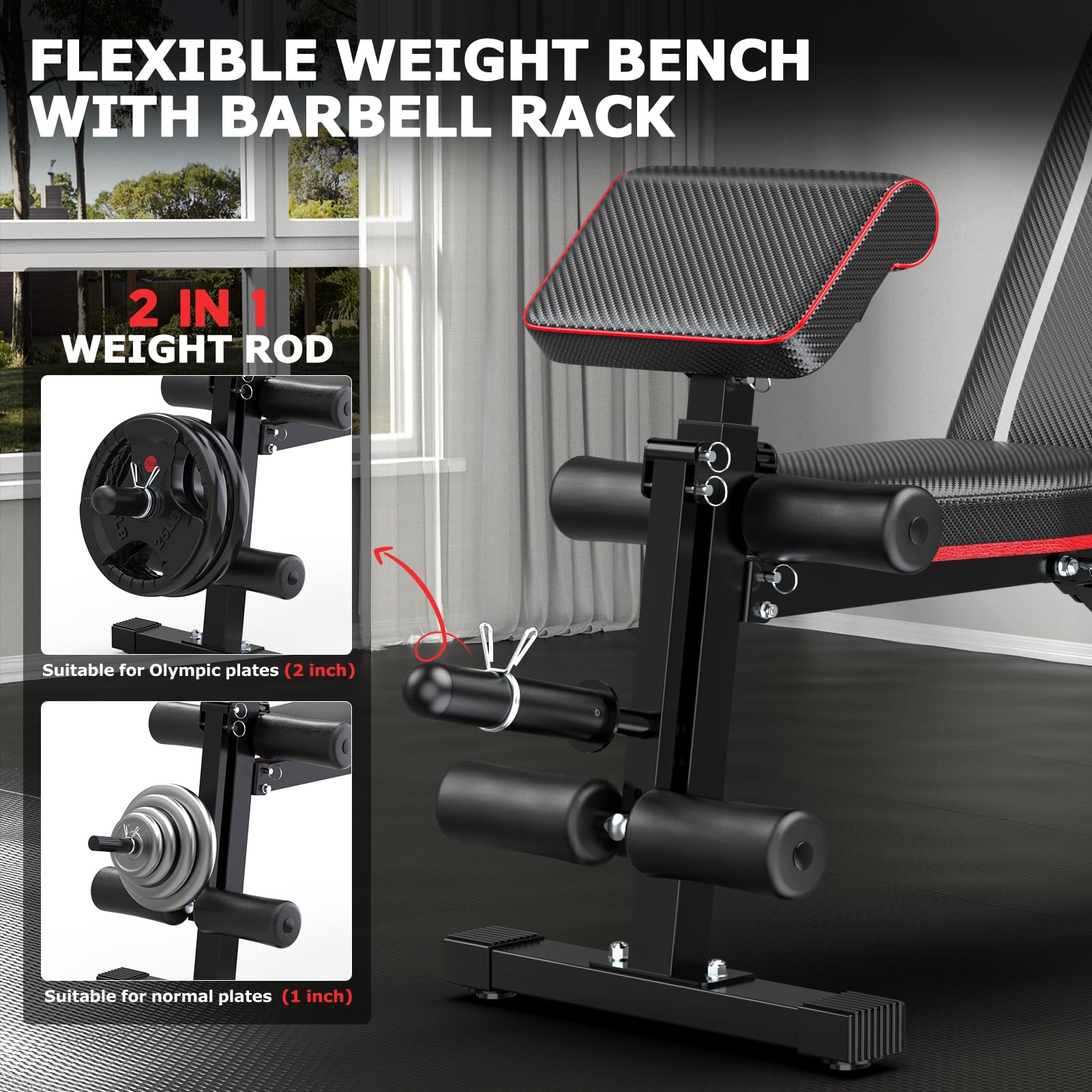 • 【Leg Extension & Preacher Pad】The workout bench for home gym is compatible with Olympic (2in) and ordinary (1in) barbell plates, and you can place 110lbs of barbell plates on the incline bench.