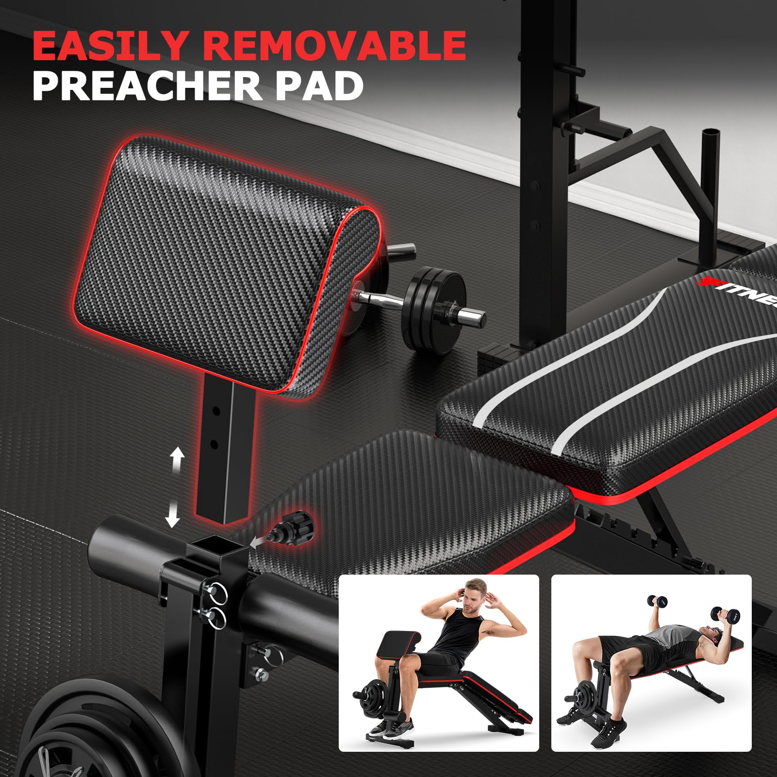 • 【Fast Adjustable Bench】This weight bench offers 7 adjustable back positions including incline, flat and decline, while it comes with a 3-position adjustable removable preacher pad to help you get a full-body workout that's tailored to your needs