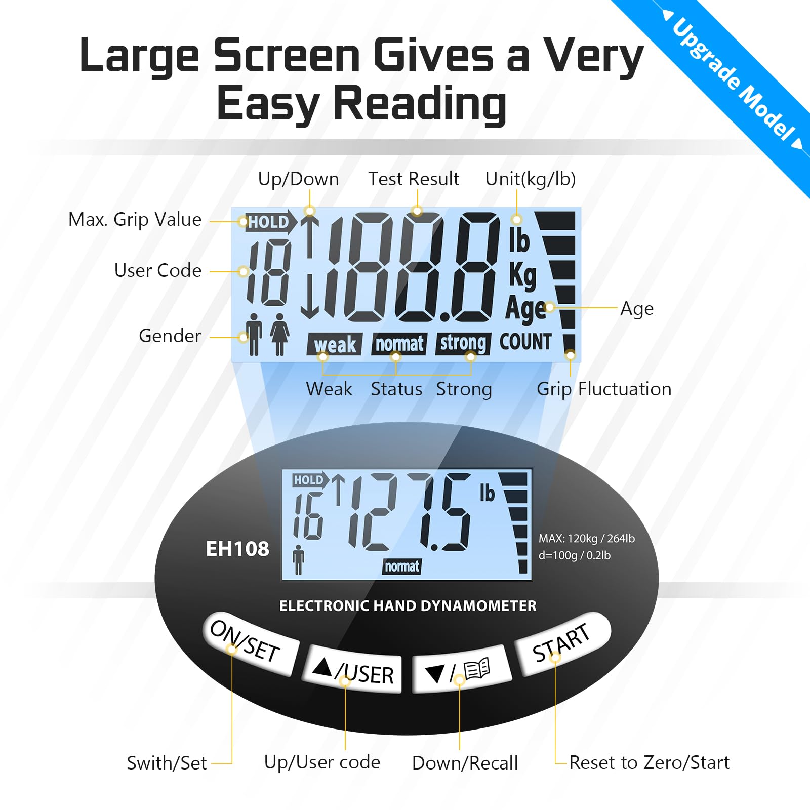 • 𝐏𝐫𝐞𝐜𝐢𝐬𝐢𝐨𝐧 𝐆𝐫𝐢𝐩 𝐒𝐭𝐫𝐞𝐧𝐠𝐭𝐡 𝐌𝐞𝐚𝐬𝐮𝐫𝐞𝐦𝐞𝐧𝐭 𝐮𝐩 𝐭𝐨 𝟐𝟔𝟓 𝐥𝐛𝐬 (𝟏𝟐𝟎𝐤𝐠) 𝐰𝐢𝐭𝐡 𝟎.𝟐 𝐥𝐛𝐬 (𝟎.𝟏𝐤𝐠) 𝐝𝐢𝐯𝐢𝐬𝐢𝐨𝐧𝐬: the hand dynamometer delivers accurate real-time readings with a precision sensor, ideal for monitoring your grip strength gains over time