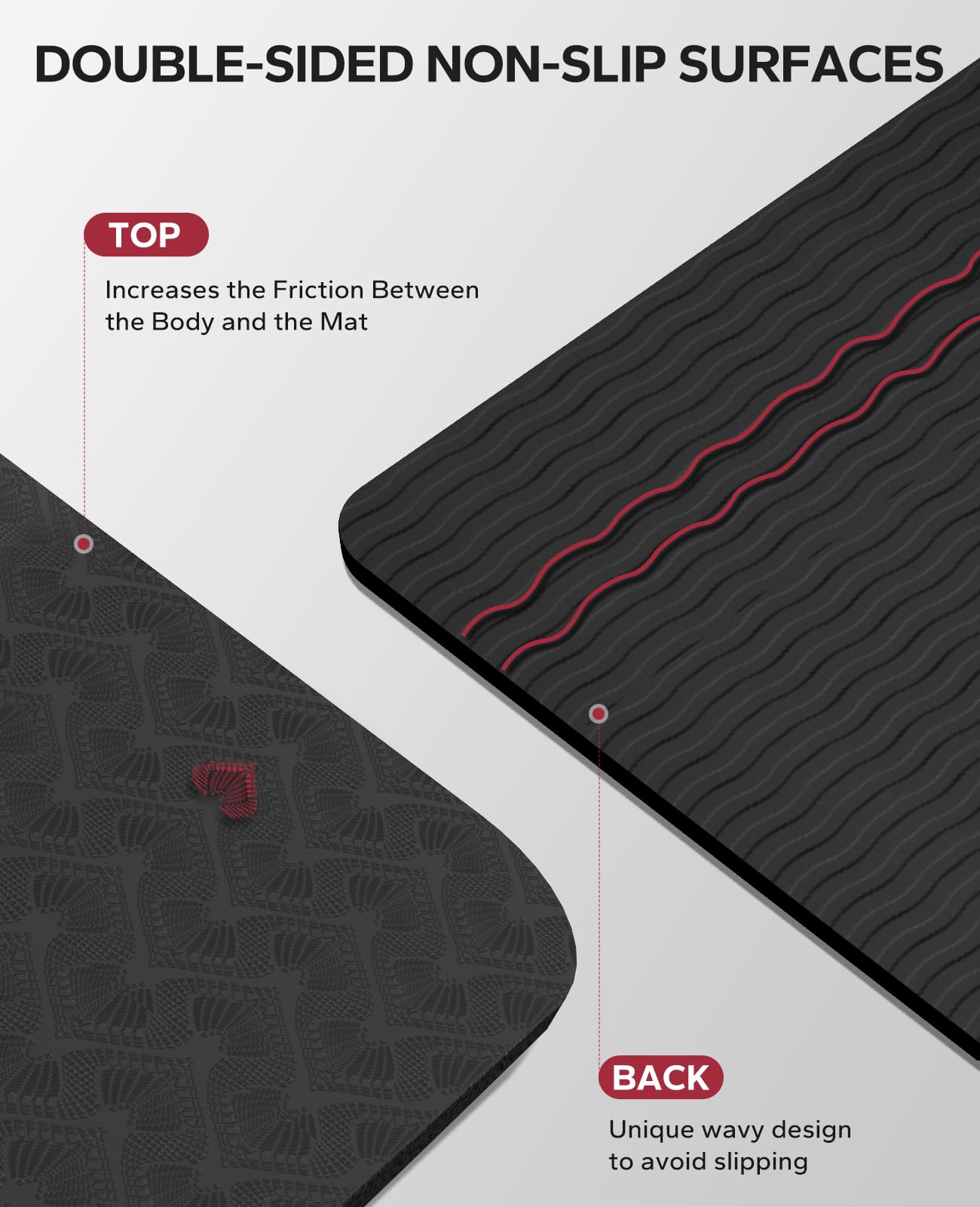 • 𝐃𝐨𝐮𝐛𝐥𝐞-𝐒𝐢𝐝𝐞𝐝 𝐍𝐨𝐧-𝐒𝐥𝐢𝐩 𝐃𝐞𝐬𝐢𝐠𝐧: Our extra wide yoga mat features a double-sided non-slip surface to keep you stable and secure during your practice without worrying about slipping or sliding. The unique wave pattern on the bottom enhances grip on a variety of surfaces, ensuring your mat stays securely in place even during the most challenging yoga poses. (Not for use on carpet)