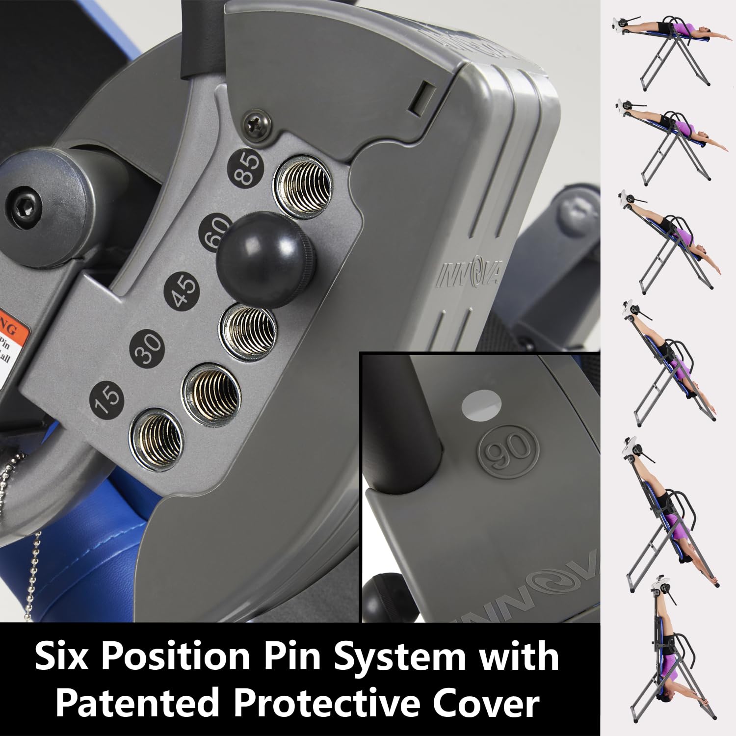- Six (6) position Adjustable pin system with added Patent Pending Protective Cover for easy positioning and safer inverting over strap systems