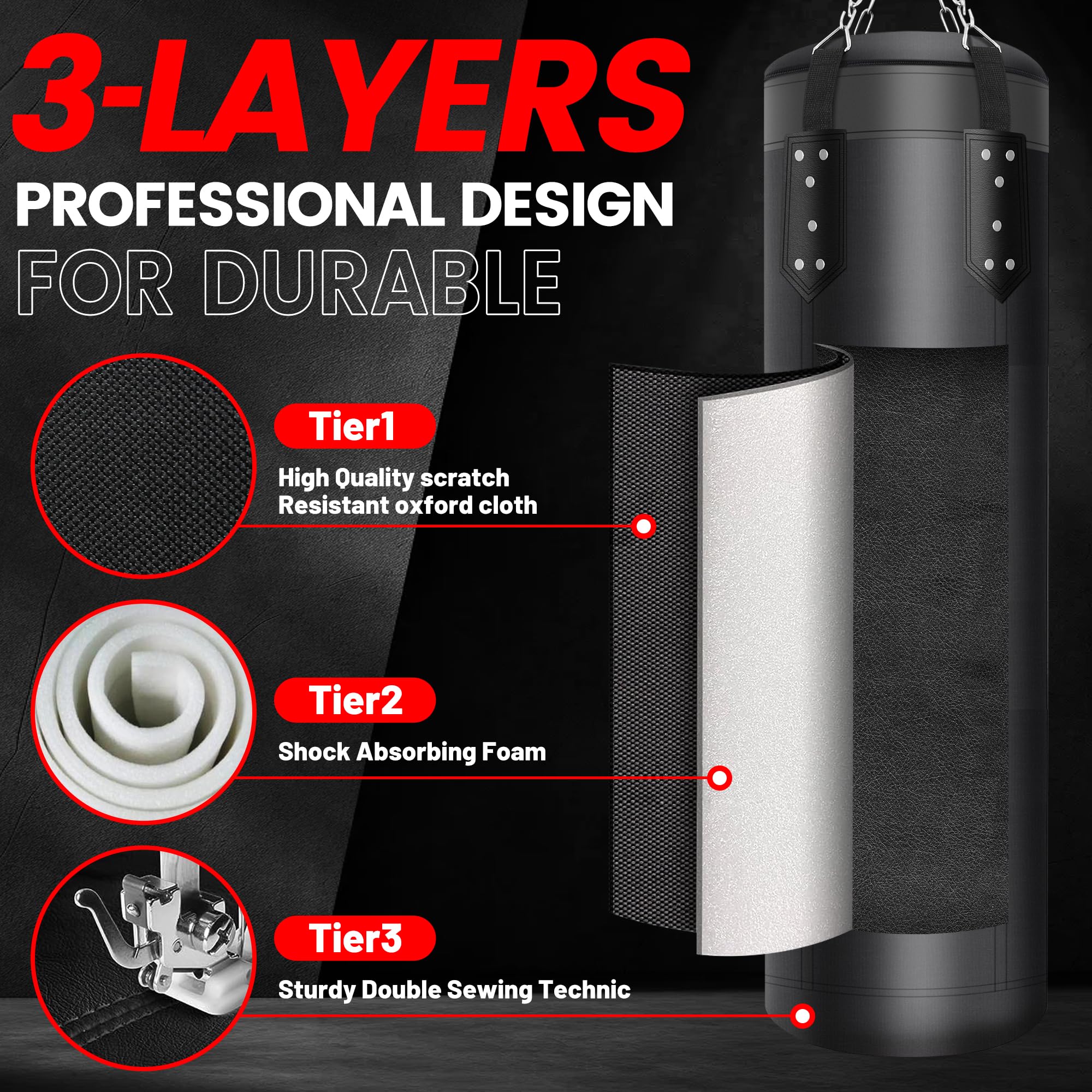 • High-density Oxford Fabric Material:Punching bag with multi-layer construction,each layer has been carefully engineered: the surface layer is made of wear-resistant thick Oxford cloth, a high-rebound shock-absorbing pearl cotton interlayer, a nylon lining, and a bottom cross-reinforced to prevent tearing, This durability ensures a more permanent boxing experience for you.