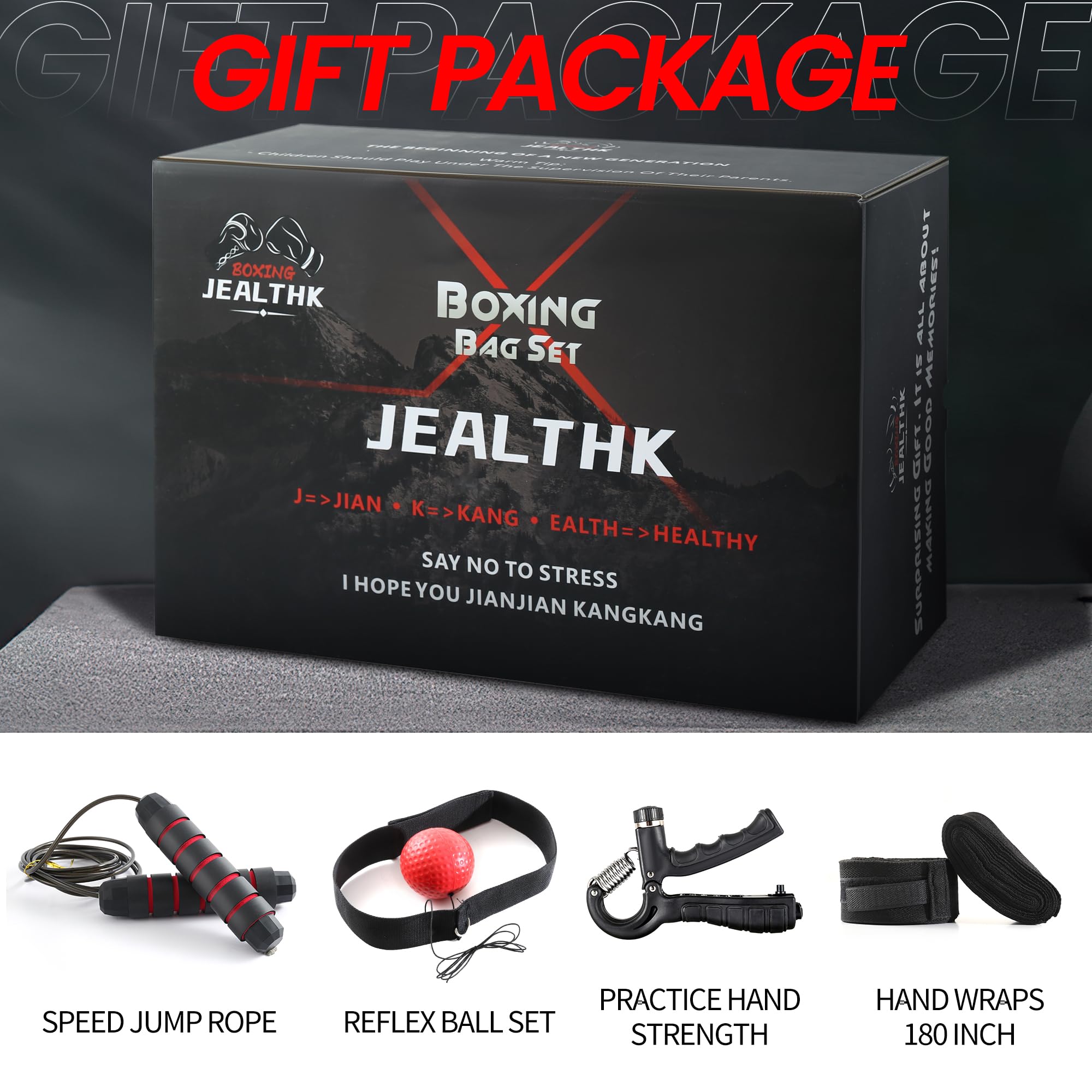 • Professional Boxing Training Equipment Set:A professional set of boxing accessories brings the ultimate experience. they contain 1 x 4ft unfilled punching bag, 1 x 12oz boxing gloves, 1 x steel chain, 1 x connecting carabiner, 1 x boxing bag hanger, 1 x jumping rope, 2x180'' Hand Wraps, 1 x counting grip strength trainer,1 x reflex ball set .4 Expansion Bolts.1 Gift Package.
