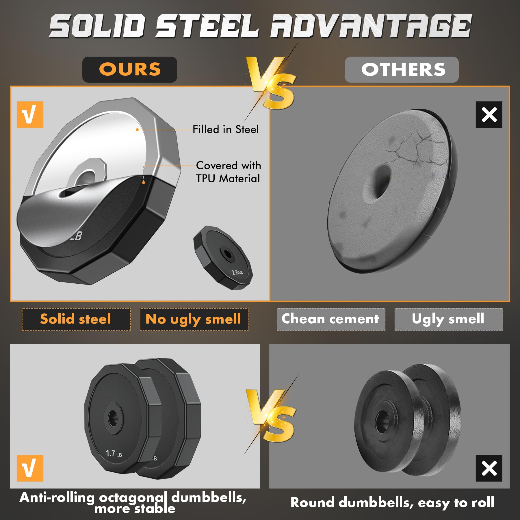 • Upgraded Solid Steel Material with Stable: Compared with the other cement material dumbbells on the market,our adjustable dumbbell set are made of solid steel,thinner,more stable, stable and true weight. Dumbbell weights plate coated is made of TPU material, high security, unbreakable,soundproof and protects the floor. Polygonal design prevents scrolling and makes for easy storage and use.Chrome connecting rod is knurled to ensure a firm grip,while the rubber-coated handle prevents slipping.