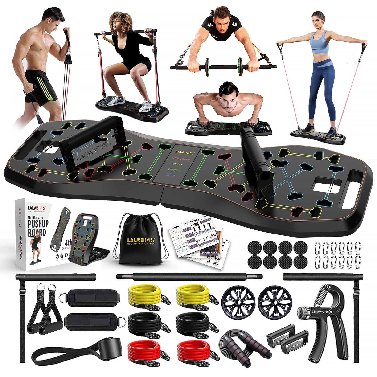 • Multi-functional Training: The multi-functional training board features an upgraded design and color-coded guide. Targeting different muscle groups (chest, shoulders, abs, biceps, back), the LALAHIGH push-up board combined with resistance bands with bar, Pilates bar, and pulley offers various training positions, allowing for more push-up angles and workout variations.